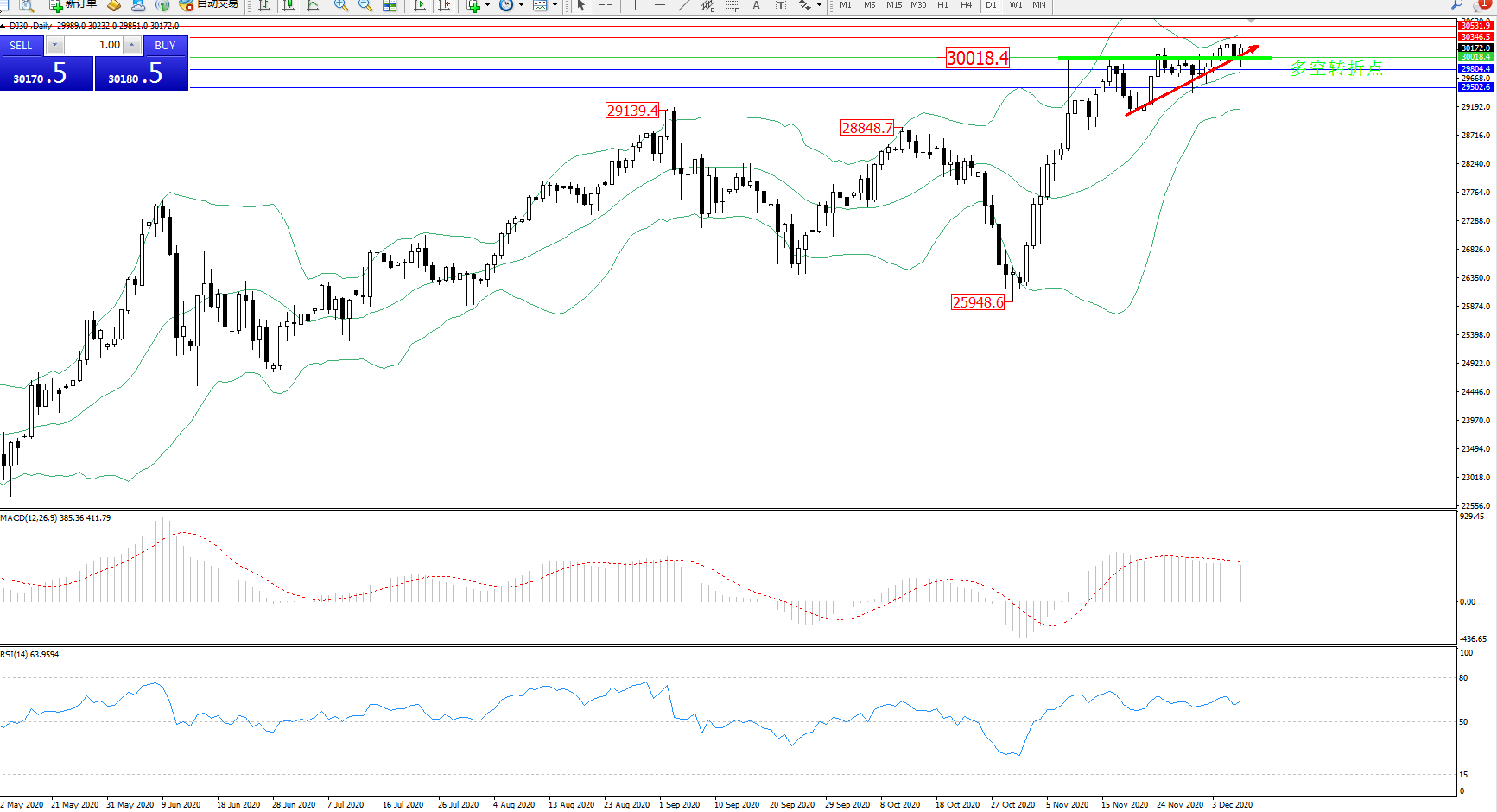 道琼斯指数DJ30—— 日K线图显示:
