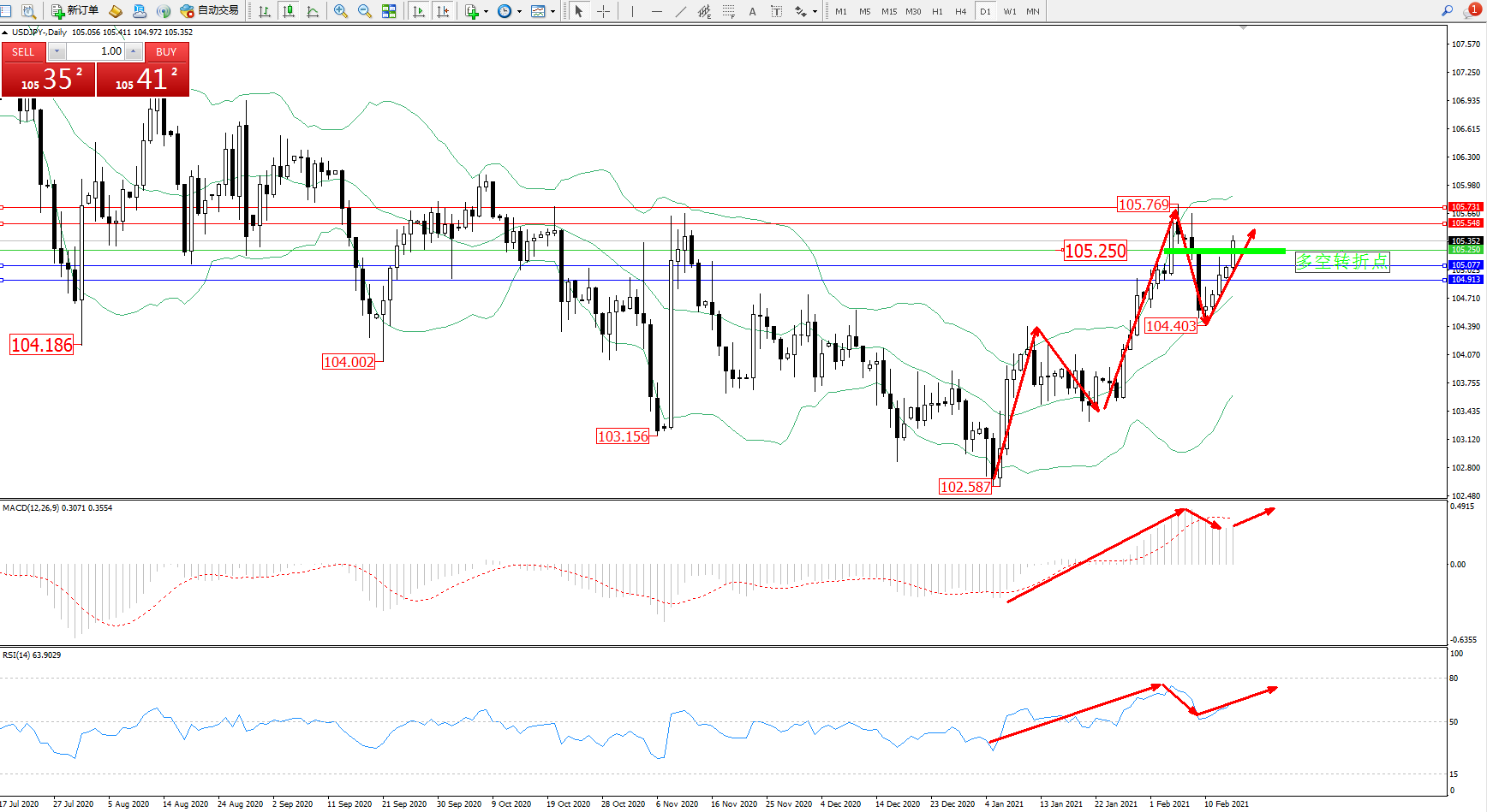 技术点评:多头动力维持在布林带指标通道中上轨区间持续震荡上扬,布林带指标呈收口走势后持续向上移动中,多头动力有进一步向上移动态势,前期高位105.769位置近在咫尺,破位在即,MACD指标处于多头区域高位整理平移中,RSI指标处于50均衡线上方持续震荡向上移动中;