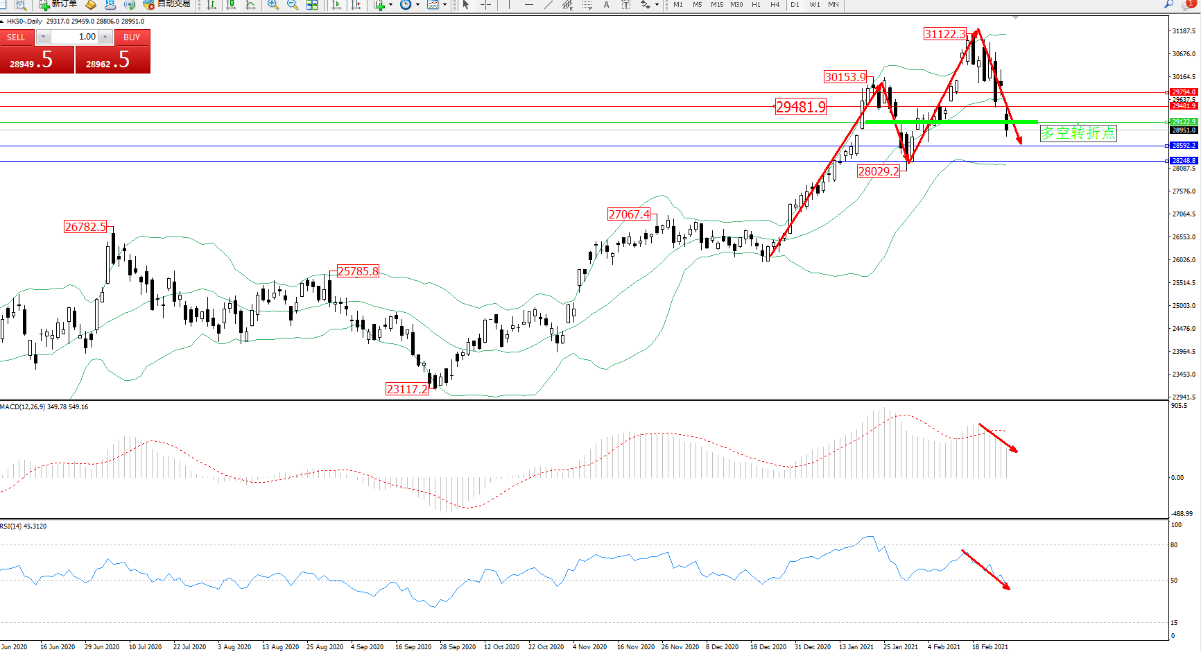 香港恒生指数2月26日(周五)收盘下跌1093.96点,跌幅3.64%,报28980.21点;港股三大指数集体大跌,行业板块近乎全线下挫,市场情绪降至冰点。恒指跌3.64%重挫1100点失守29000大关,恒生科技指数跌5.71%报8954点。科技股再度遭受重创,美团、网易暴跌超8%,腾讯、阿里巴巴跌超4%,所有活跃股均表现低迷,惟农业股小幅上扬。近日港股命途多舛,前日因港府计划加股票印花税导致大跌,昨日市场稍有起色,今日因外围暴跌再度跟随市场下挫,前期报团股陆续遭到血洗,市场明显无新热点接力。南下资金净流入30.94亿港元,大市成交额再上3200亿港元。2月行情收官恒指涨2.46%,国指涨0.34%,恒生科技指数跌4.31%。恒生指数公司今天宣布截至2020年12月31日恒生指数系列季度检讨结果,君实生物(1877.HK)获纳入恒生综合指数、恒生小型股指数、恒生医疗保健指数、恒生港股通指数、恒生港股通中小型股指数,变动将于2021年3月15日(星期一)起生效。据香港电台网站、无线新闻等港媒报道,香港疫情回升,截至当日零时,香港新增新冠肺炎确诊病例24例,其中本地病例占18例,包括1例源头不明。