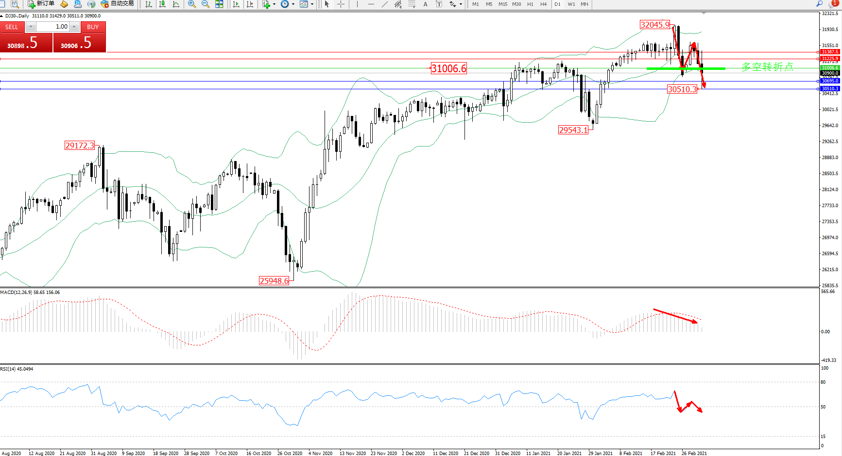 道琼斯指数DJ30—— 日K线图显示: