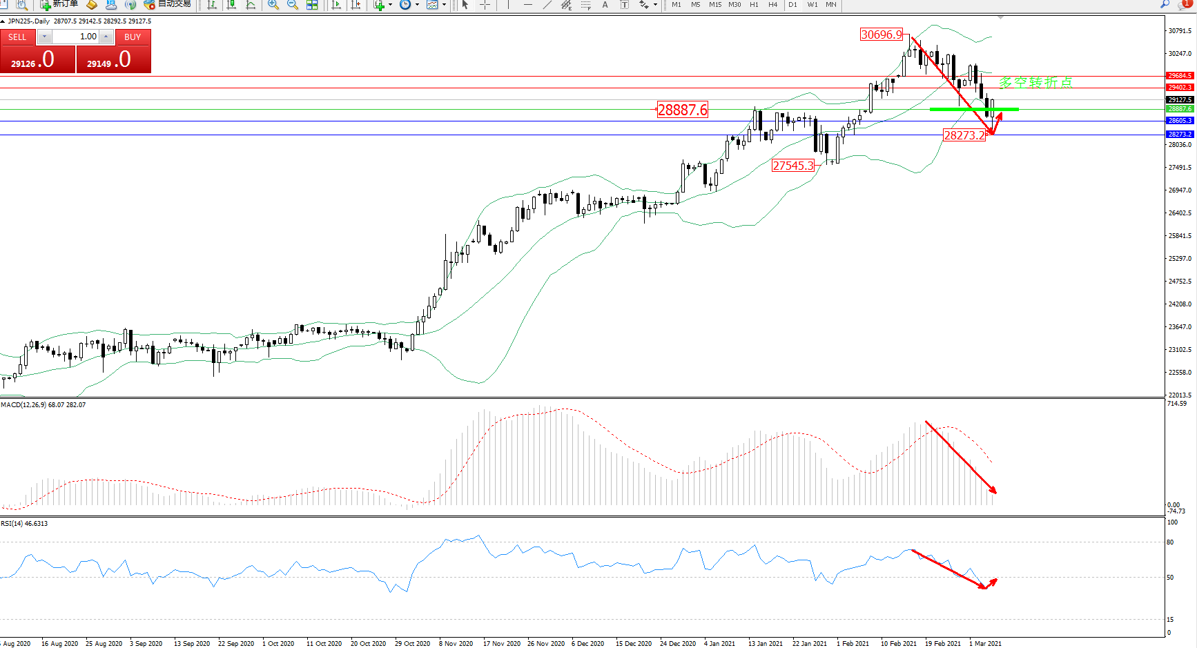 技术点评:高位空头动力维持震荡弱势下行,低位下破布林带指标下轨附近节点抵达28273位置后得到支撑,多头动力伺机入场,开始反转上移,布林带指标呈收口走势后开始张口,多头动力短期或有回升迹象,MACD指标处于多头区域向下移动走势持续中,RSI指标处于50均衡线下方维持窄幅整理中;