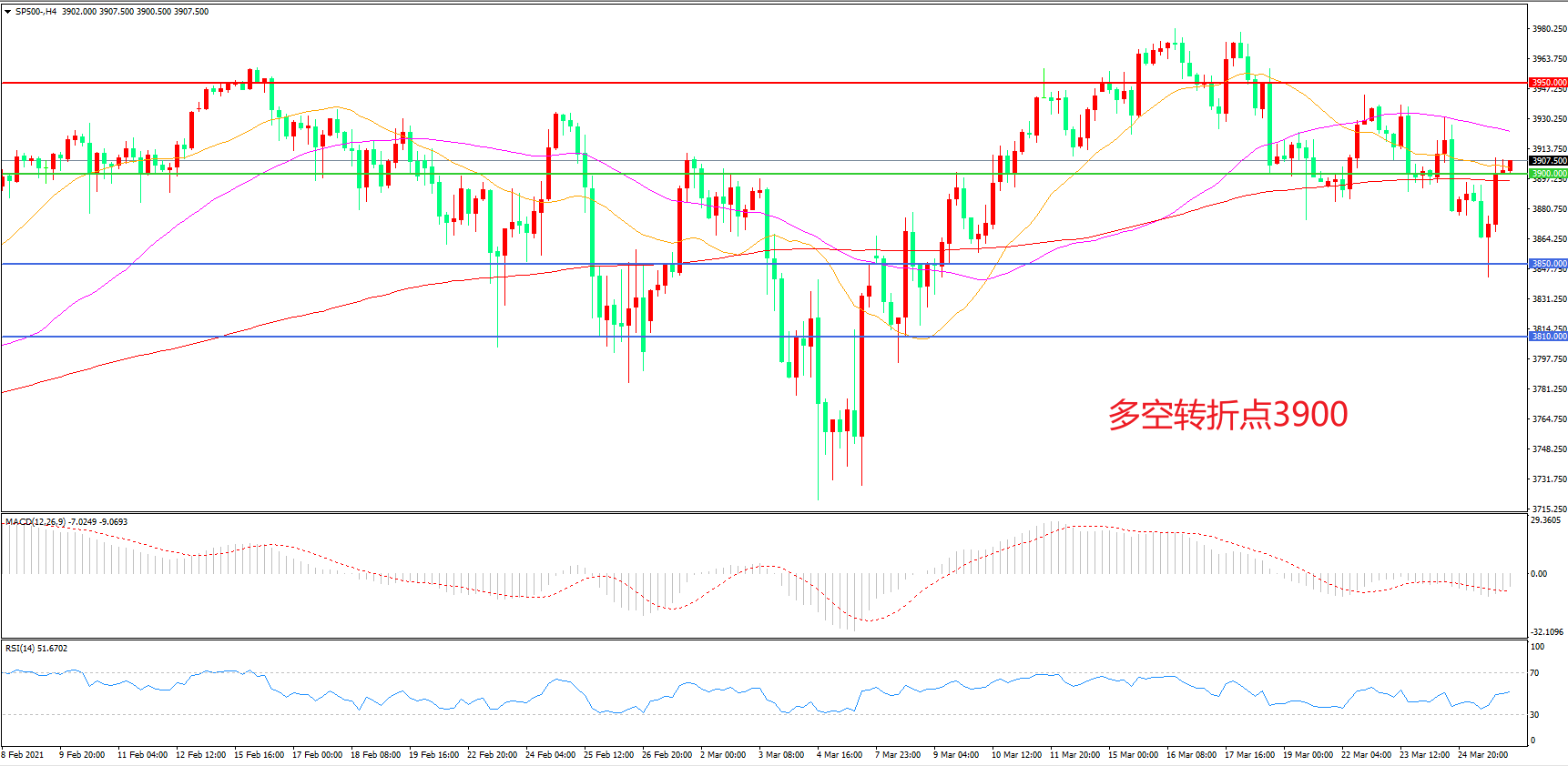 4小时图看,标普500先跌后涨,短期走势有所企稳,但形态上依然处于空头趋势,55周期均线成为上方阻力,3850成为下方支撑,MACD绿柱缩短,RSI指标走平,日内延续震荡概率较大。