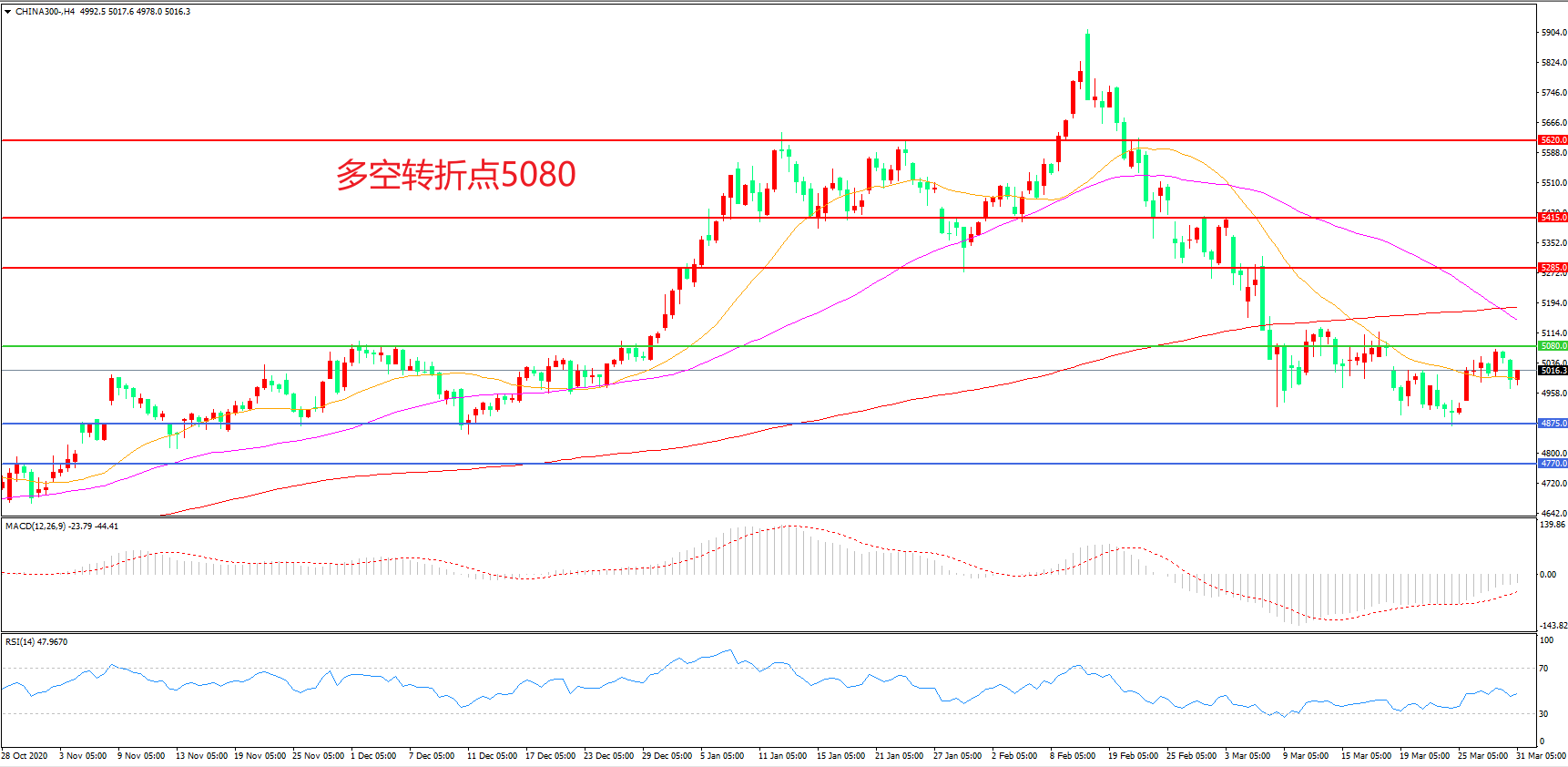 4小时图看,沪深300延续低位震荡走势,整体波幅收窄,5080成为上方阻力,21周期均线形成下方支撑,MACD绿柱缩短,RSI指标走平,日内延续震荡概率较大。