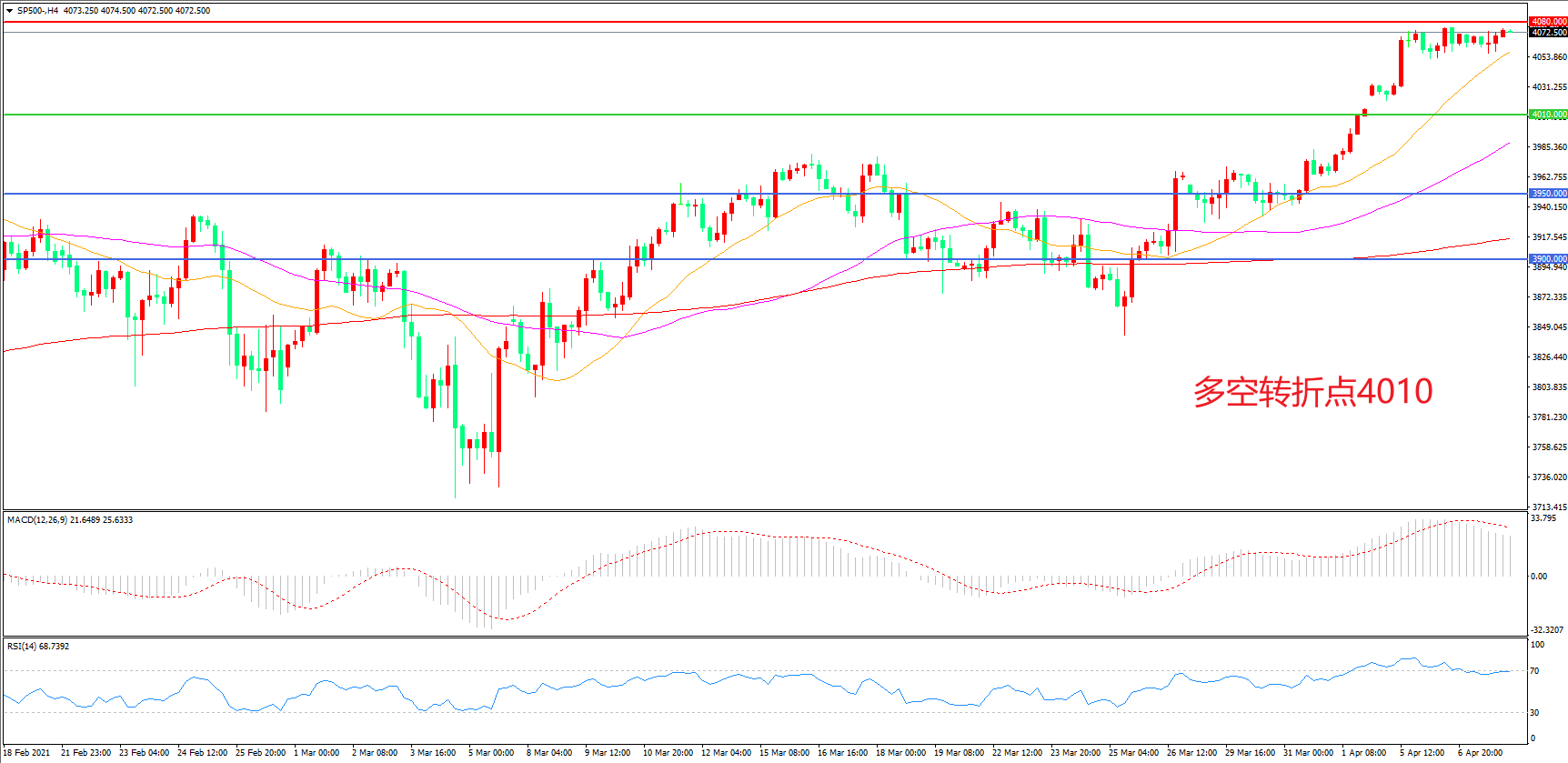 4小时图看,标普500长阳拉升,突破前期整理区间,短期表现偏强,21周期均线成为短期支撑,MACD红柱增加,RSI指标走平,节后震荡上行概率较大。