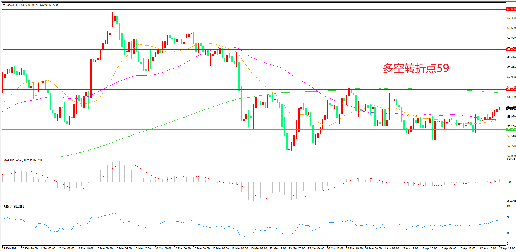 4小时图看,油价回踩59美元支撑后震荡上行,短期走势回暖,200均线成为上方阻力,55周期均线成为下方支撑,MACD红柱增加,RSI指标走平,日内延续震荡概率较大。