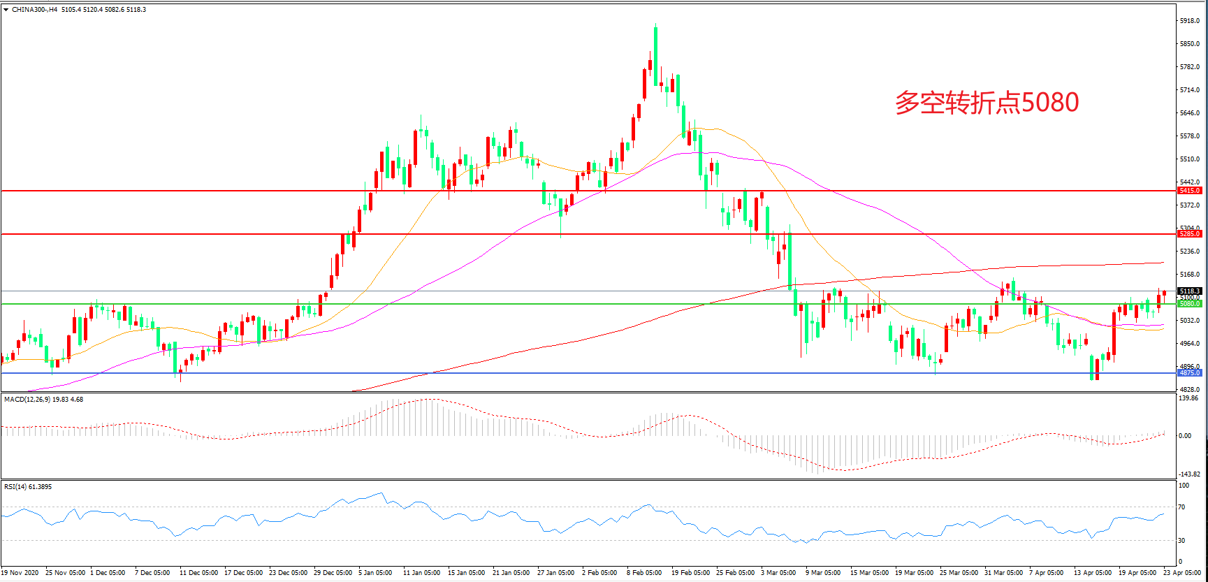 4小时图看,沪深300长阳拉升后延续上行态势,低点逐渐抬高,短期表现依然较强,短期均线粘合形成下方支撑,200周期均线成为上方阻力,MACD红柱增加,RSI指标走平,日内延续震荡上行概率较大。