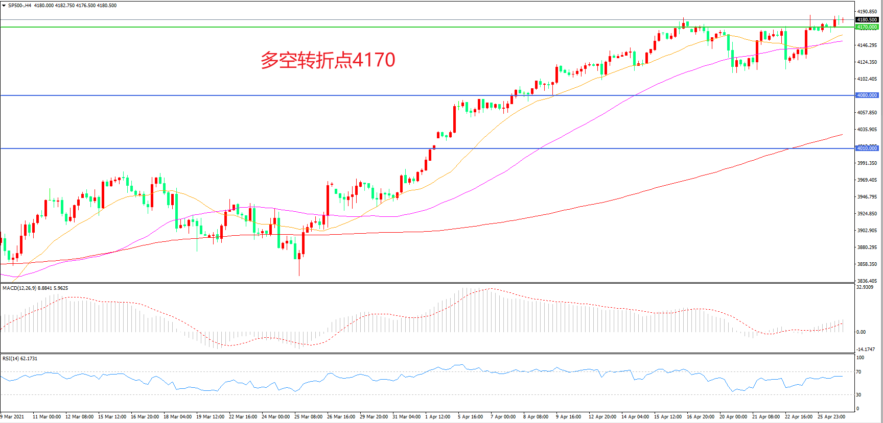 周一(4月26日),市场预期本周美联储会议将保持货币宽松立场,苹果等多家公司公布的财报将显示一季度业绩稳健,标普500在亚蓝筹科技股支持下震荡走高,收报4180.75点。相较去年,推高市场的主力已经从少数大型科技股转变为多数股票的参与,美国上市公司在疫情过后正在迎来一个出色的财报季。