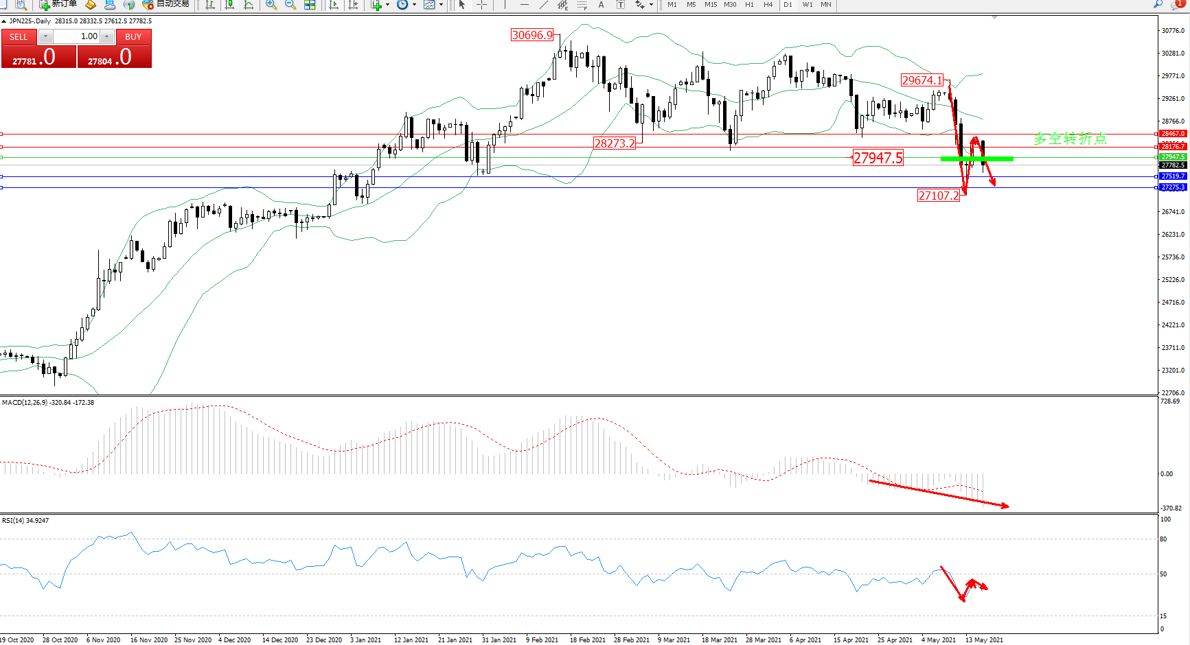日经225指数5月17日(周一)收盘下跌263.97点,跌幅0.94%,报27820.50点。经济学家估计日本经济第一季萎缩,且面临双底衰退风险;与去年的疫情封锁相比,今年日本经济遭受疫情紧急情况的冲击可能小得多,不过双底衰退的风险仍在。日本经济第一季度可能萎缩4.5%,其走出去年大流行病期间大幅下滑的势头出现逆转。尽管最近数据表明经济具有比先前预期更大的韧性,但政府上周五把疫情紧急状态扩大到更多地区,则加大了经济在本季度萎缩的风险。日经新闻未指出消息来源报道,东京证交所在考虑将目前15:00(日本当地时间)收盘的交易时间延长。此举旨在吸引更多其他时区的外国投资者,让散户投资者在下班后更加容易交易。东京证交所的市场管理委员会将于本周尽快开会商讨。