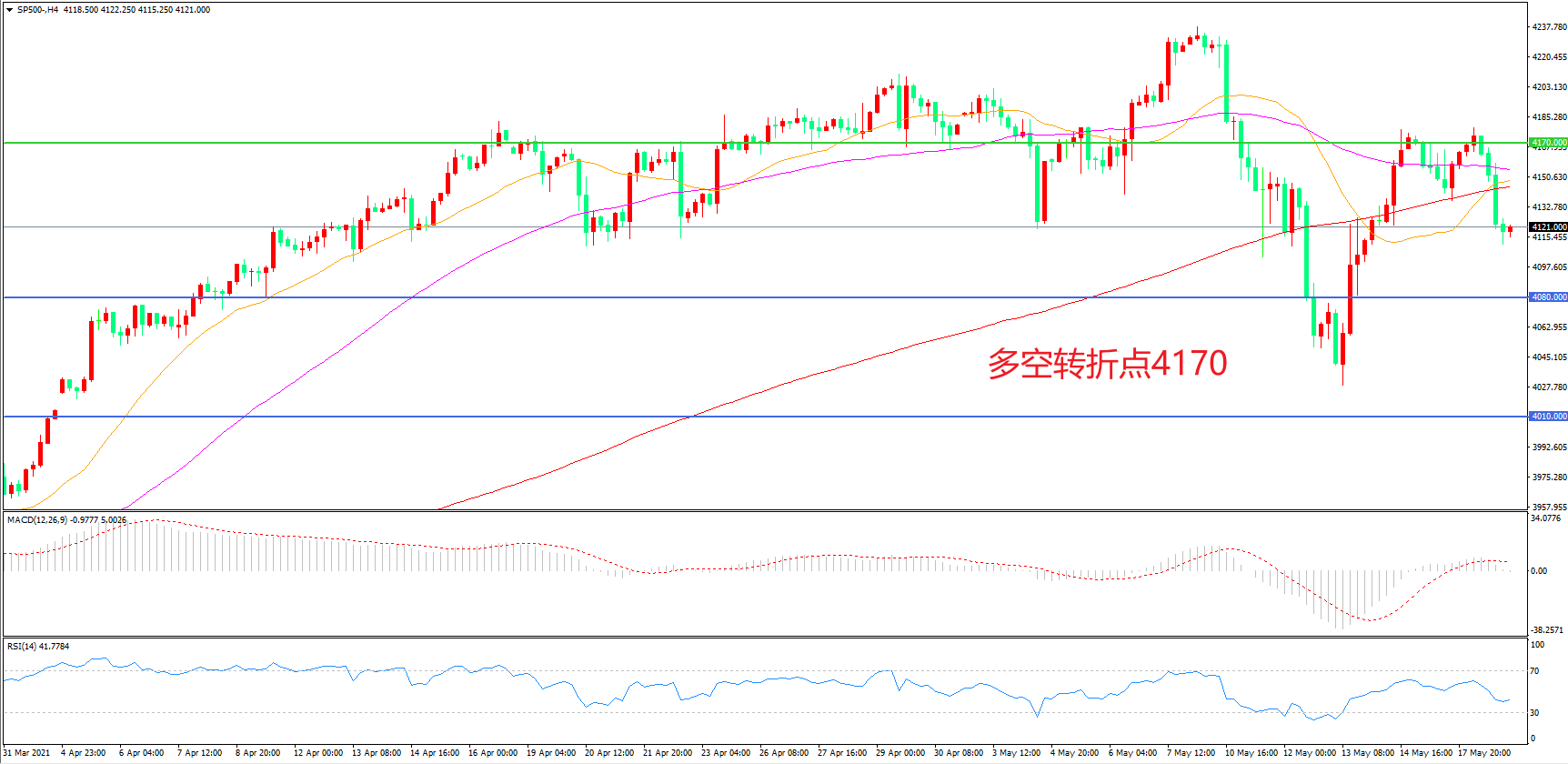 4小时图看,标普500触碰4170后大幅回落,短期走势陷入低迷,均线系统形成的支撑被跌破,MACD红柱减少,RSI指标走平,日内震荡下行概率较大。