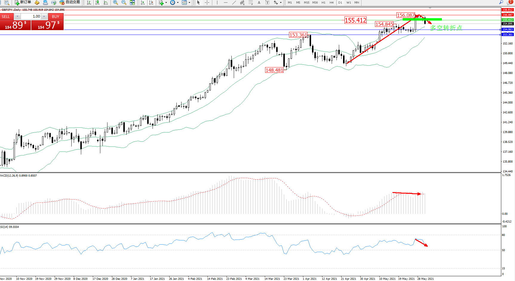 技术点评:多头动力延续布林带指标通道中上轨区间持续震荡上扬,高位抵达156.087位置后遇阻震荡回撤,即将触及中轨附近位置,短期或出现整理回调走势,布林带指标呈收口走势中,关注中上轨区间节点,MACD指标处于多头区域高位维持整理平移中,RSI指标处于多头区域维持震荡后有继续下移迹象;