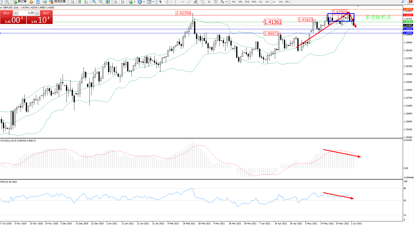 备选策略:1.41361上方看涨,目标1.42121、1.42773