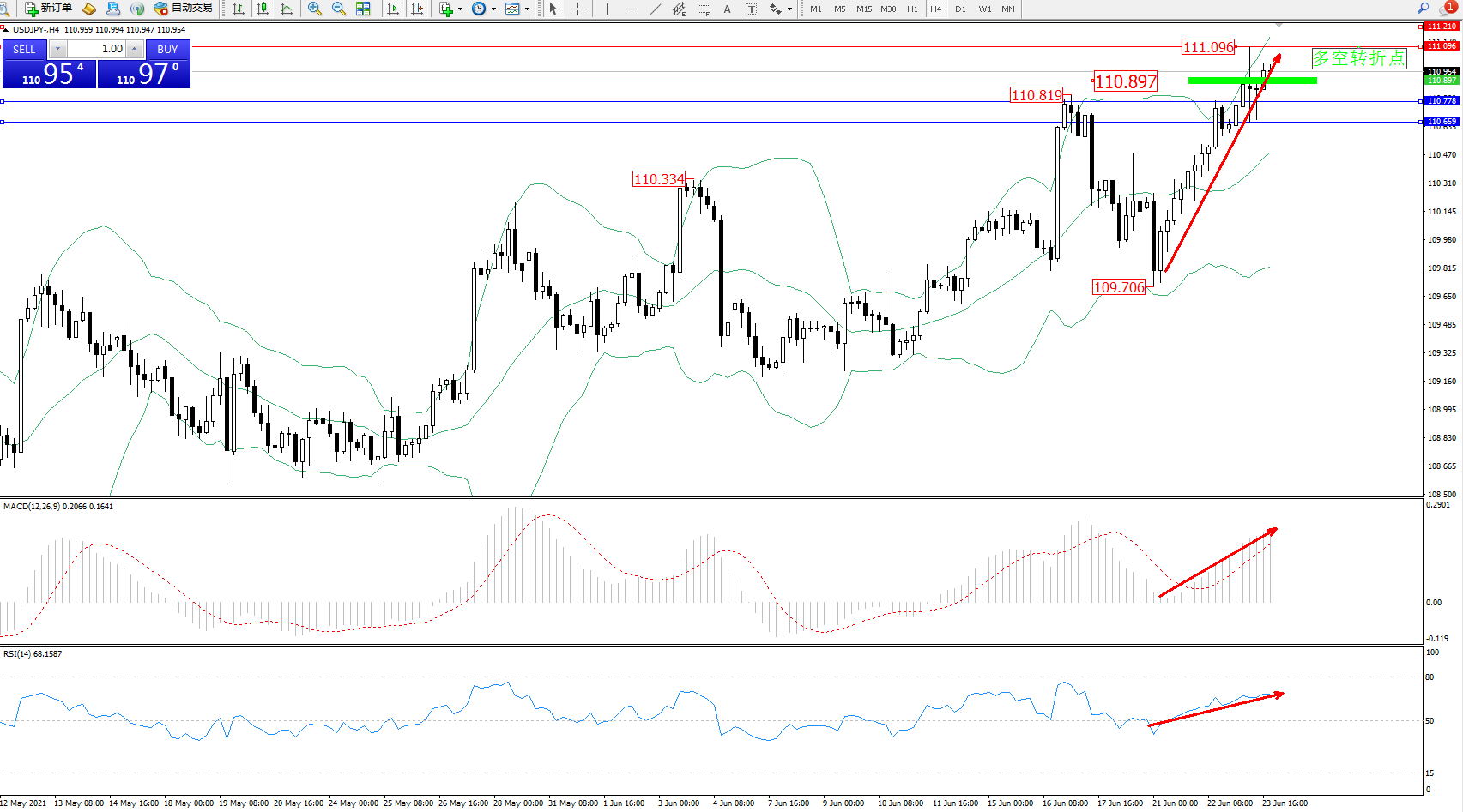 技术点评:多头动力延续布林带指标通道上轨内侧持续震荡上扬,高位抵达110.096附近节点后开始巨震,多头动力仍有拉升态势,布林带指标呈张口走势态势良好,MACD指标处于多头区域高位不断拉升中,RSI指标处于多头区域不断徘徊上扬后开始走平;