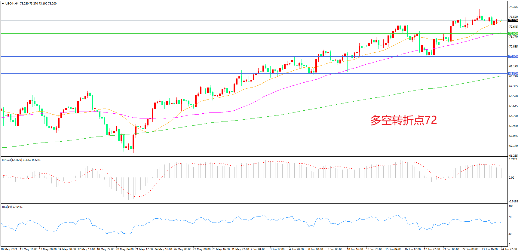 周四(6月24日),德国的零售状况出现30多年以来最大涨幅,引发欧洲燃料需求将复苏的预期,再次印证了市场需求旺盛,美国WTI原油延续强势表现,收报73.20美元/桶。目前沙特石油大臣表示将会调控石油价格以遏制全球通胀,那么也就意味着OPEC很有可能会在下周的会议上再次提高原油产量以应对过高的价格,短期趋势仍然看涨。