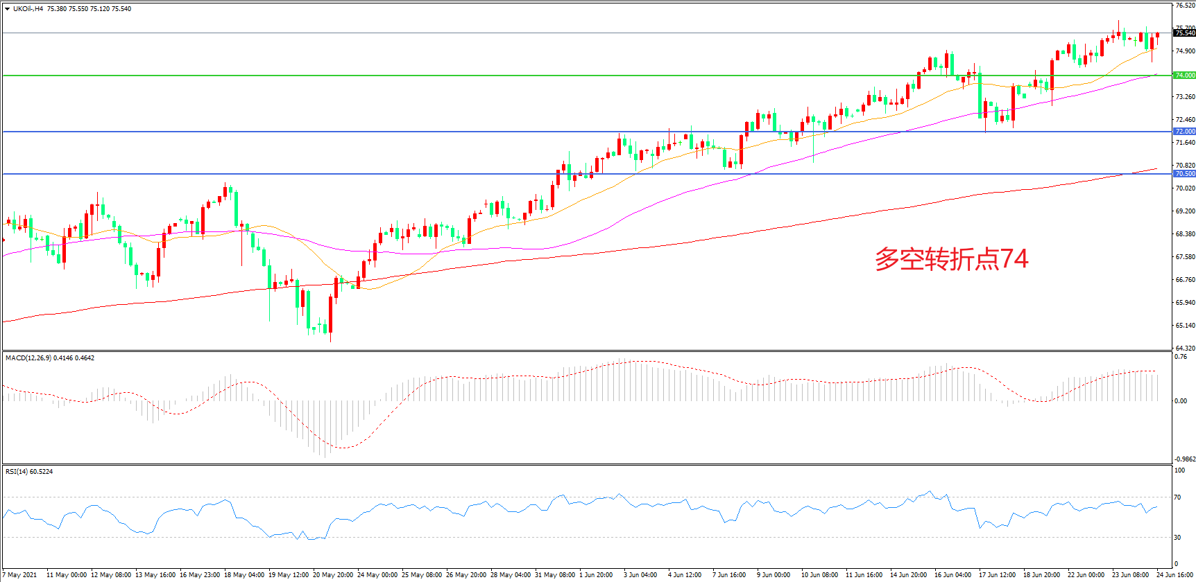 4小时图看,油价突破74美元阻力后再度上行,短期表现强势,均线系统成为下方支撑,MACD红柱增加,RSI指标走平,日内震荡上行概率较大