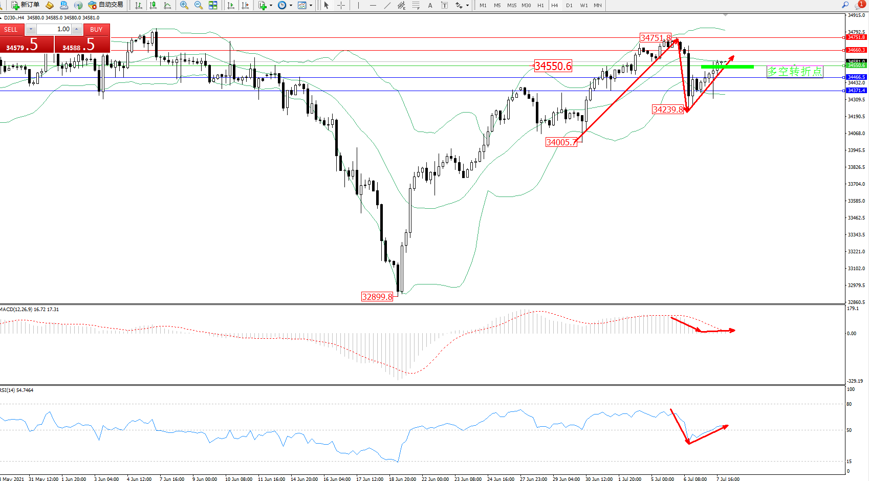 技术点评:多头动力延续布林带指标通道中上轨区间持续震荡上扬,高位急速下挫至34239位置后得到支撑反转上扬,触及布林带指标中轨附近节点后开始徘徊,多头动力有进一步短期上移迹象,布林带指标呈收口走势开始平移中,MACD指标处于多头区域高位回撤至0轴线上方弱势徘徊中,RSI指标处于50均衡线附近持续震荡中;