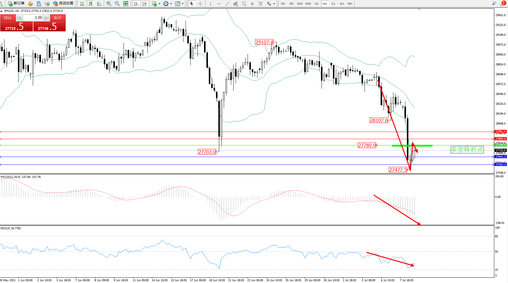 技术点评:空头动力延续布林带指标下轨附近持续强势下挫,低位抵达27477位置后短暂回升,但下行趋势态势良好,布林带指标呈张口走势持续中,MACD指标处于空头区域低位持续下探中,RSI指标处于空头区域持续震荡下行后低位开始于短暂整理态势;