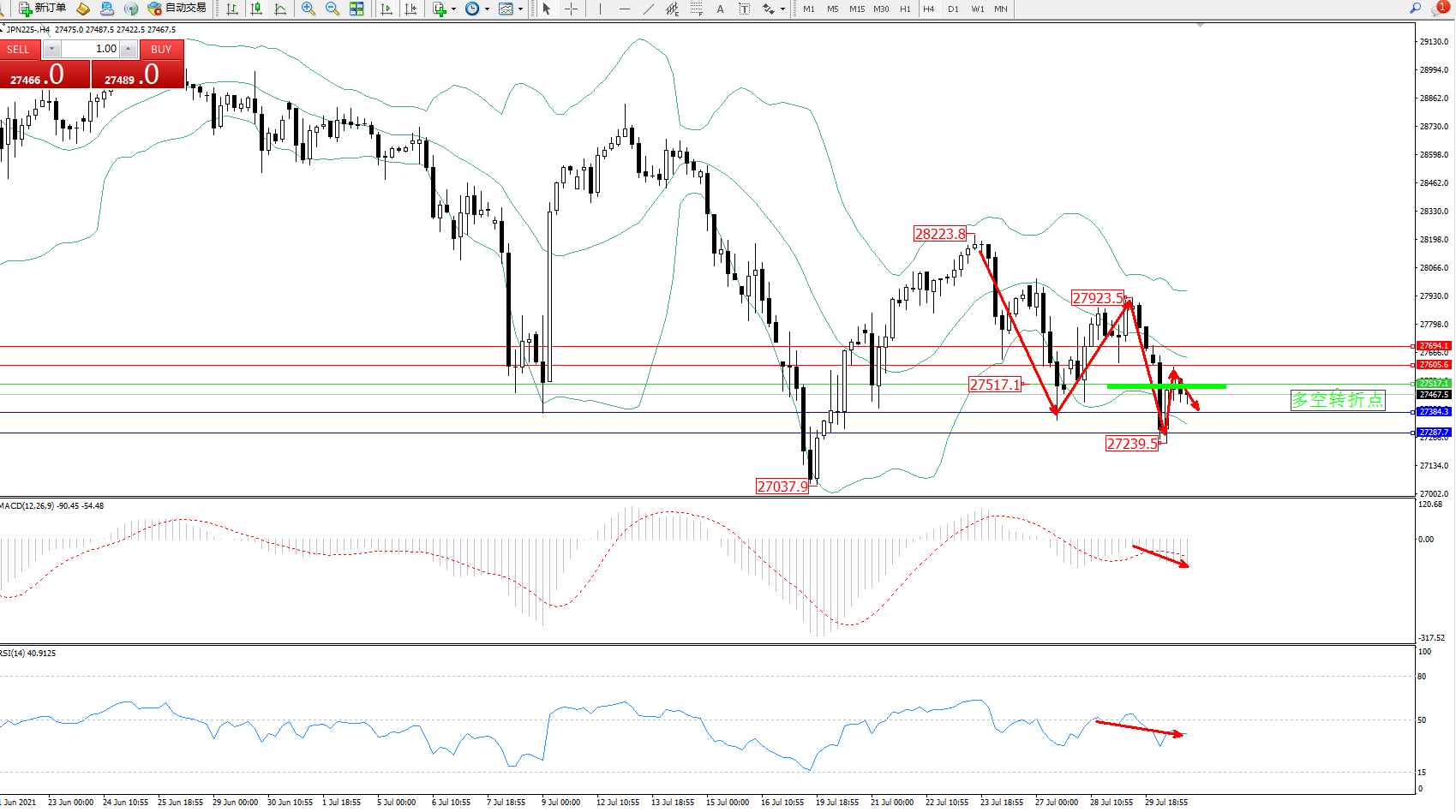 技术点评:空头动力延续布林带指标通道中下轨区间持续震荡下行,低位抵达27239位置后短暂回升,空头下行趋势态势良好,布林带指标呈下行趋势持续中,MACD指标处于0轴线下方空头区域维持整理,RSI指标处于50均衡线下方空头区域维持整理中;