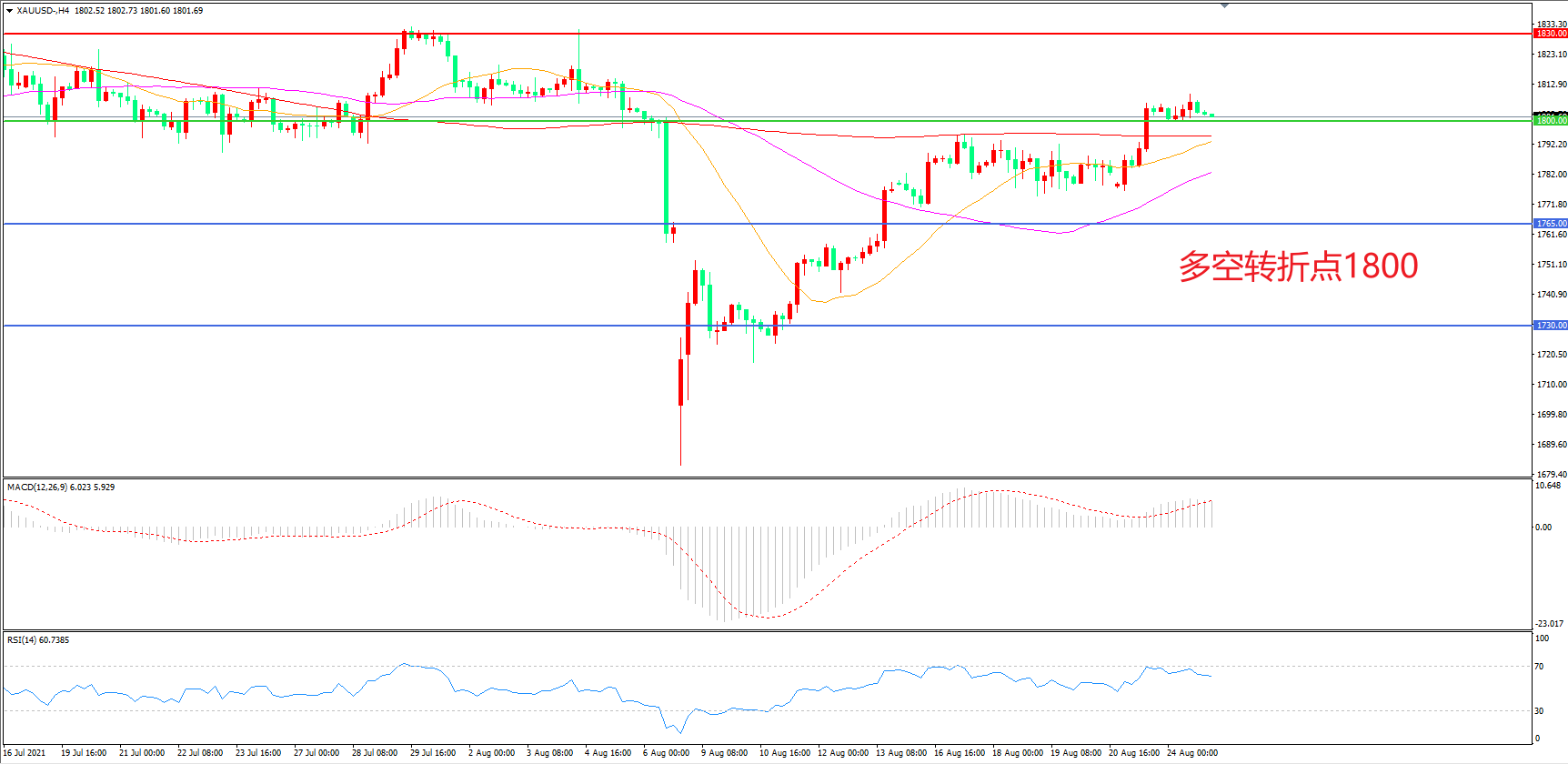 周二(8月24日),在美国疫情反复和美联储Taper渐行渐近的背景下,美元指数持续走软,现货黄金受到提振,收报于1802.47美元/盎司。现在市场普遍预期是,近期的疫情和经济表现可能主要影响美联储加息概率,实际利率回升仍是大概率事件,如果鲍威尔在杰克逊霍尔央行年会上的讲话偏向鸽派,那么我们会看到金价回升至1850美元的水平。