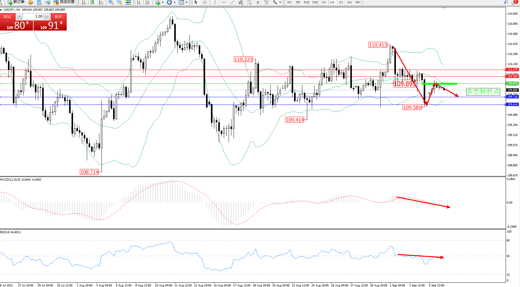 技术点评:空头动力延续布林带指标通道中下轨区间持续震荡向下移动,低位抵达109.581位置后短暂回升,即将触及布林带指标中轨附近节点后短暂遇阻,空头有继续向下移动迹象,布林带指标呈收口走势中,MACD指标处于0轴线下侧弱势徘徊中,RSI指标处于50均衡线下方弱势徘徊中;