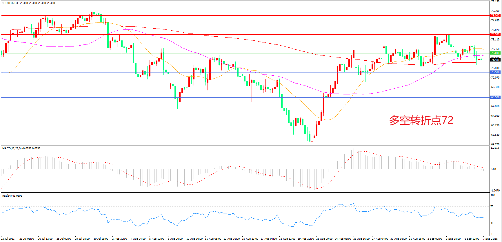 4小时图看,油价围绕着55周期均线窄幅震荡,72美元成为多空分水岭,MACD红柱缩短,RSI指标走平,日内震荡上行概率较大。
