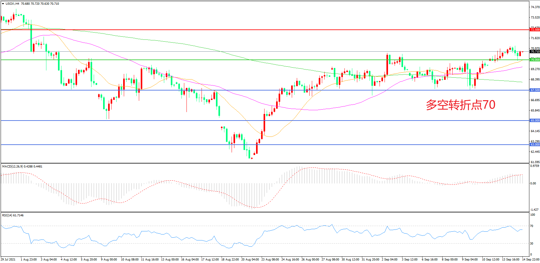4小时图看,油价以70美元为依托震荡上行,短期走势有所回暖,均线系统逐渐发散,MACD红柱增加,RSI指标走平,日内震荡上行概率较大。