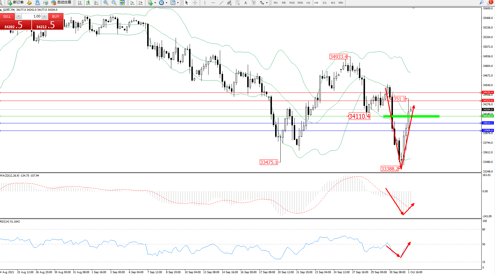 技术点评:空头动力延续布林带指标通道中下轨区间持续震荡下挫,低位抵达33388位置后急速回升,呈V型反转上扬态势良好,触及布林带指标中轨附近节点后有继续拉升态势,布林带指标呈张口走势后开始有收口迹象,MACD指标处于空头区域低位震荡缓慢上移,RSI指标处于空头区域持续震荡上移至50均衡线附近徘徊;