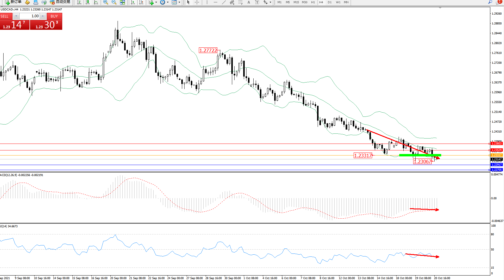 技术点评:空头动力延续布林带指标通道中下轨区间持续震荡下行,低位抵达1.23067位置节点后开始低位整理,短期空头下行态势良好,且未见止步迹象,布林带指标呈缓慢收口持续向下移动中,MACD指标处于空头区域维持整理平移,RSI指标处于50均衡线下方空头区域维持整理徘徊向下移动;