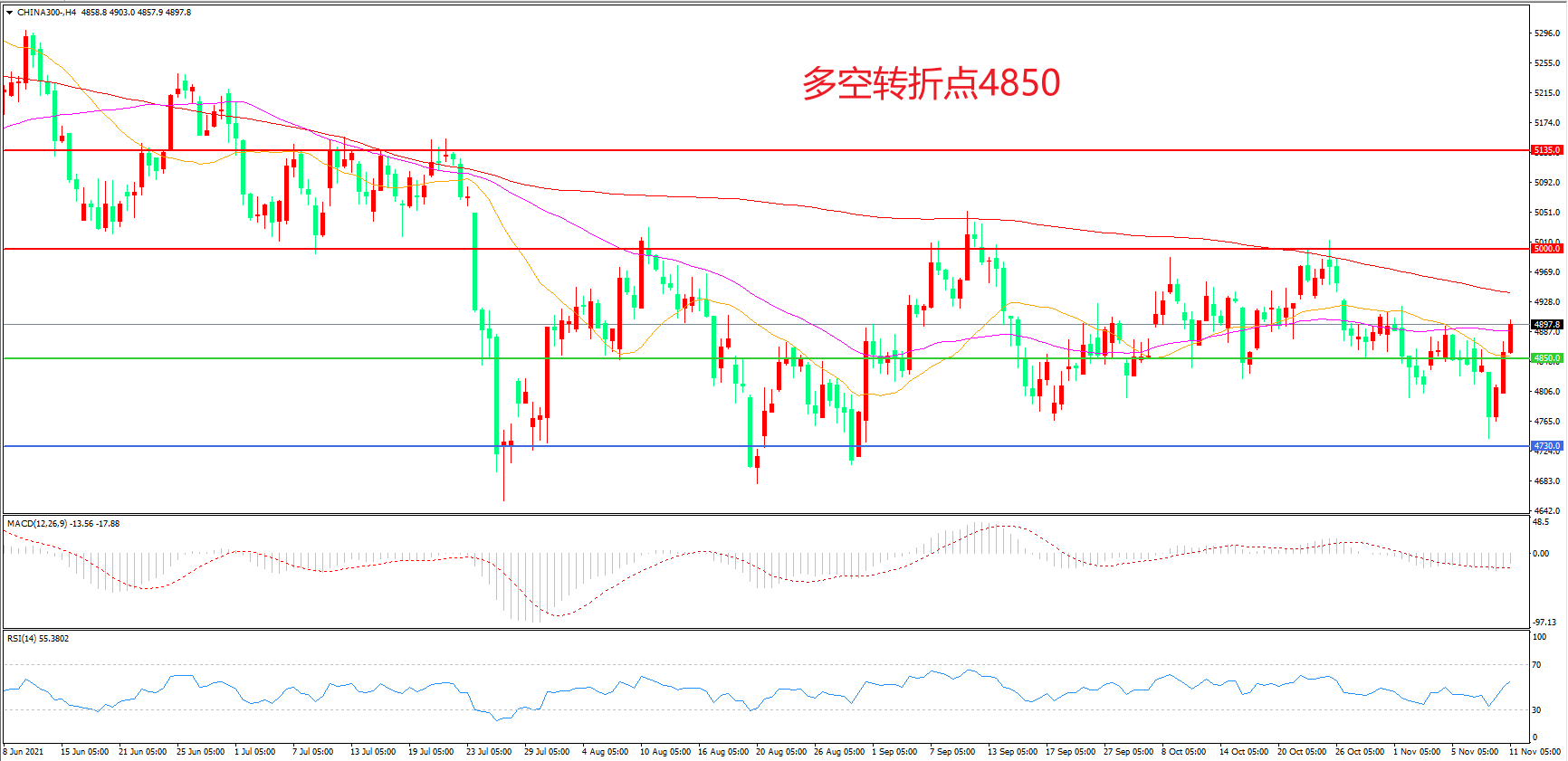4小时图看,沪深300大幅破位后出现反弹,短期走势有所回暖,但均线系统依然成为上方阻力,4850成为多空分水岭,MACD绿柱缩短,RSI指标向上,日内延续震荡概率较大。