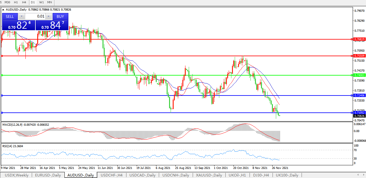 技术面简析:日图均线呈有序空头排列,汇价维持弱势下行态势,MACD运行于0轴下且量能持续放量,RSI小幅反弹后再度下行,预计汇价大概率将进一步下行。