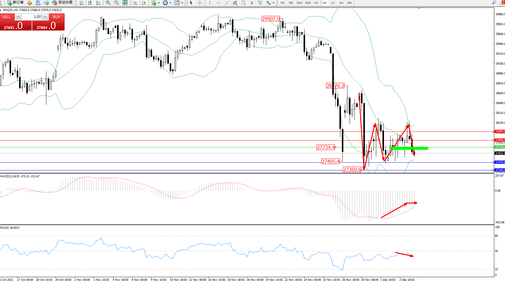 日经指数JPN225——4小时K线图显示: