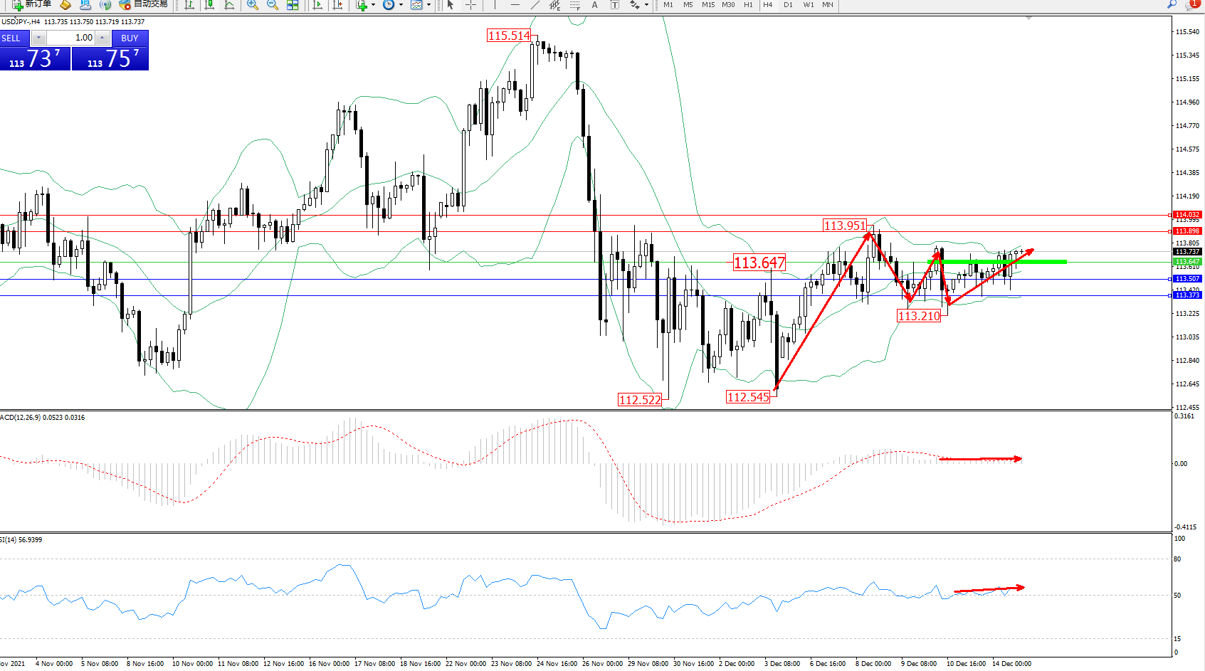 技术点评:低位多头动力延续布林带指标通道中上轨区间持续震荡上扬,高位抵达113.951位置后遇阻回撤,纠结于布林带指标通道内维持窄幅震荡中,短期波幅空间开始逐渐收窄后有向上移动迹象,布林带指标呈收口走势中,MACD指标处于0轴线上側弱势徘徊中,RSI指标处于50均衡线上方窄幅整理中;