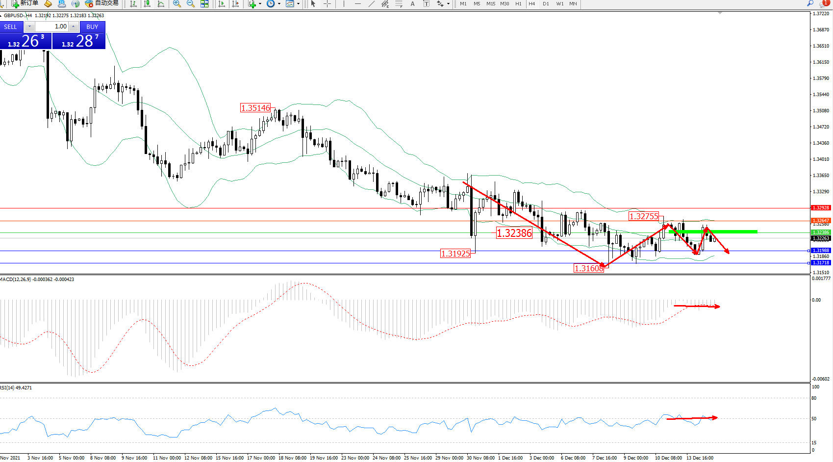 交易策略:1.32386下方看跌,目标1.31988、1.31718