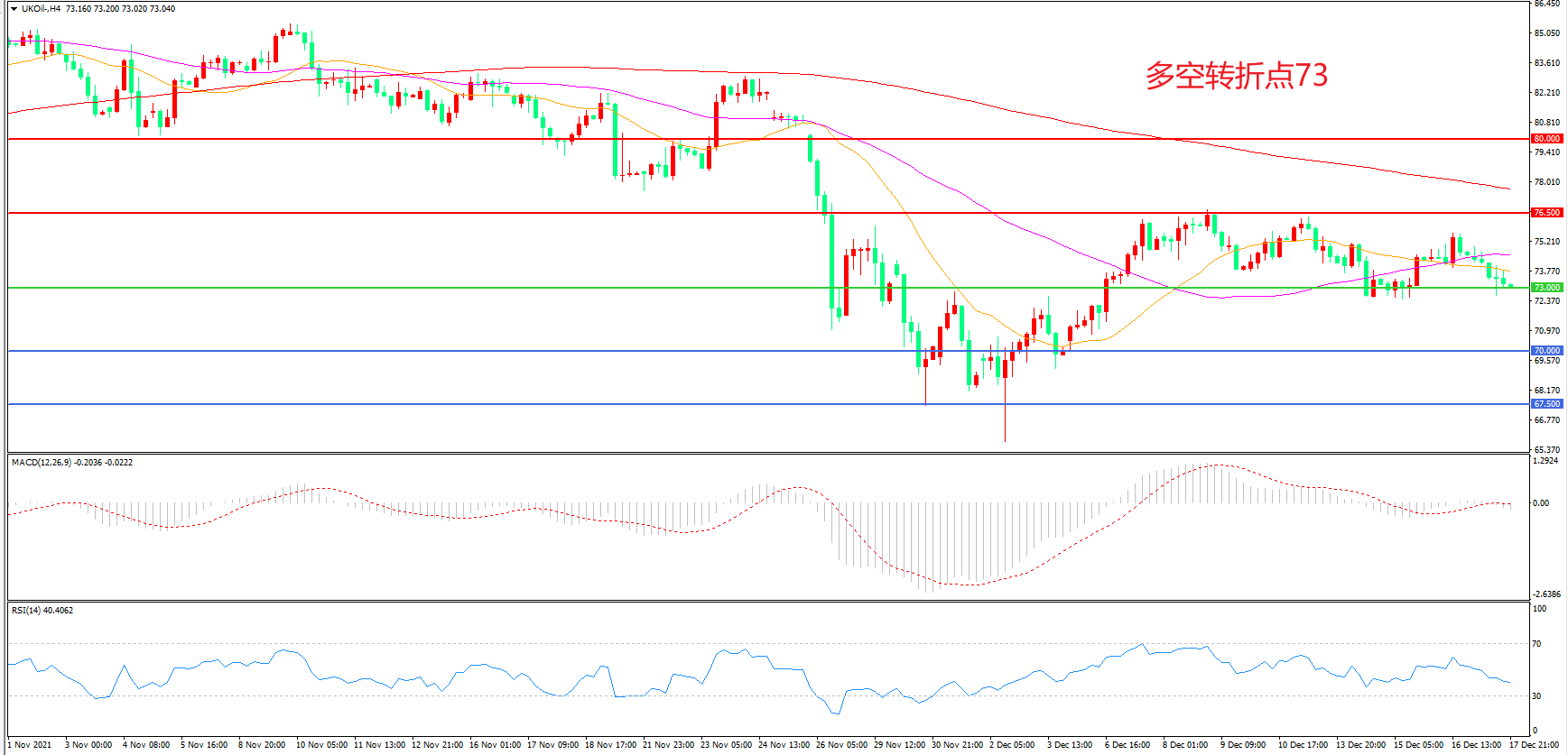 4小时图看,油价延续区间震荡形态,76.5美元成为上方阻力,73美元成为多空分水岭, MACD红柱缩短,RSI指标走平,日内延续震荡概率较大。
