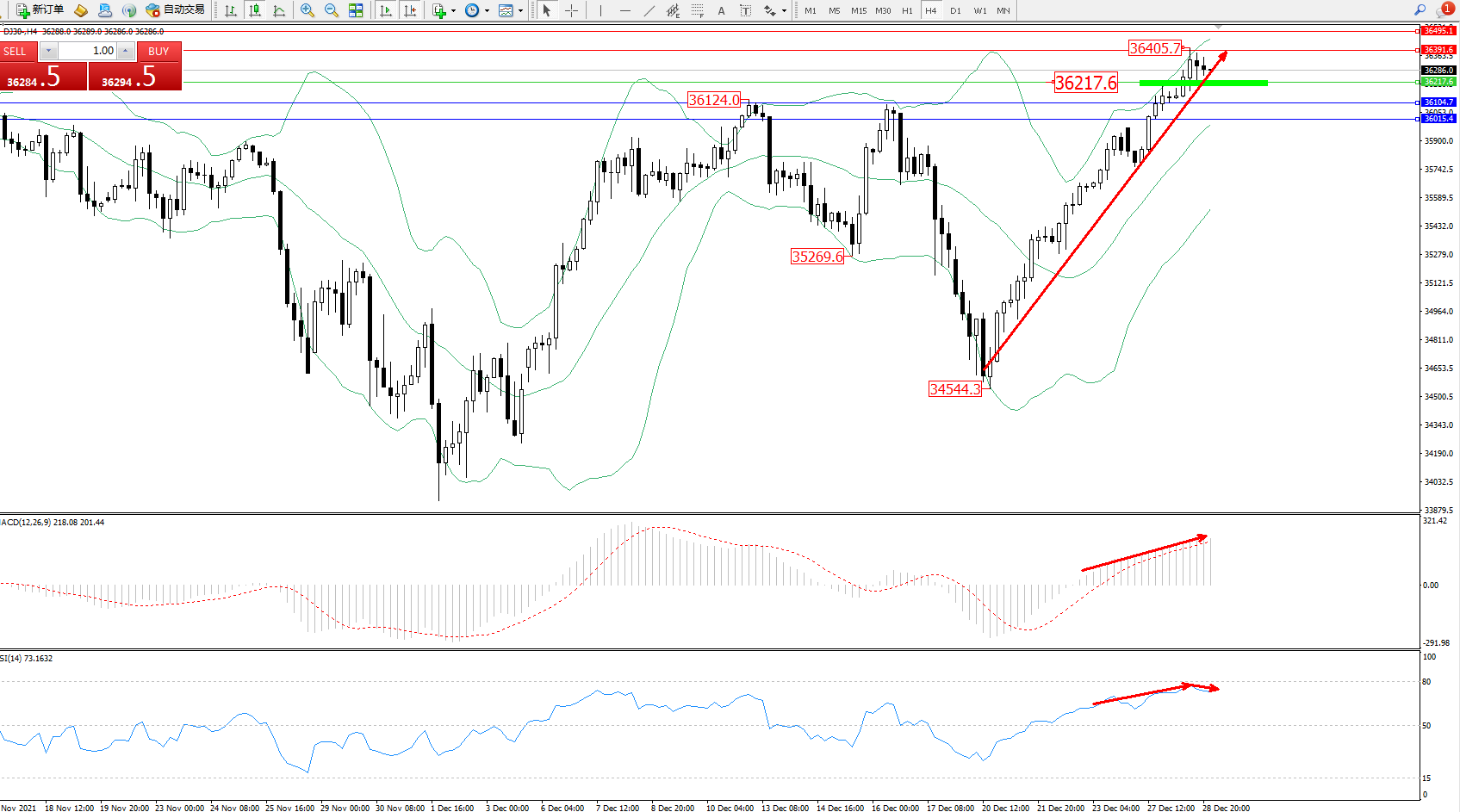 技术点评:多头动力延续布林带指标上轨附近持续震荡上扬,高位抵达36405附近节点后遇阻震荡,多头拉升动力态势良好,且有继续上行态势,布林带指标呈上行走势态势良好,MACD指标处于多头区域维持震荡上扬,RSI指标处于高位整理后有回撤走势;