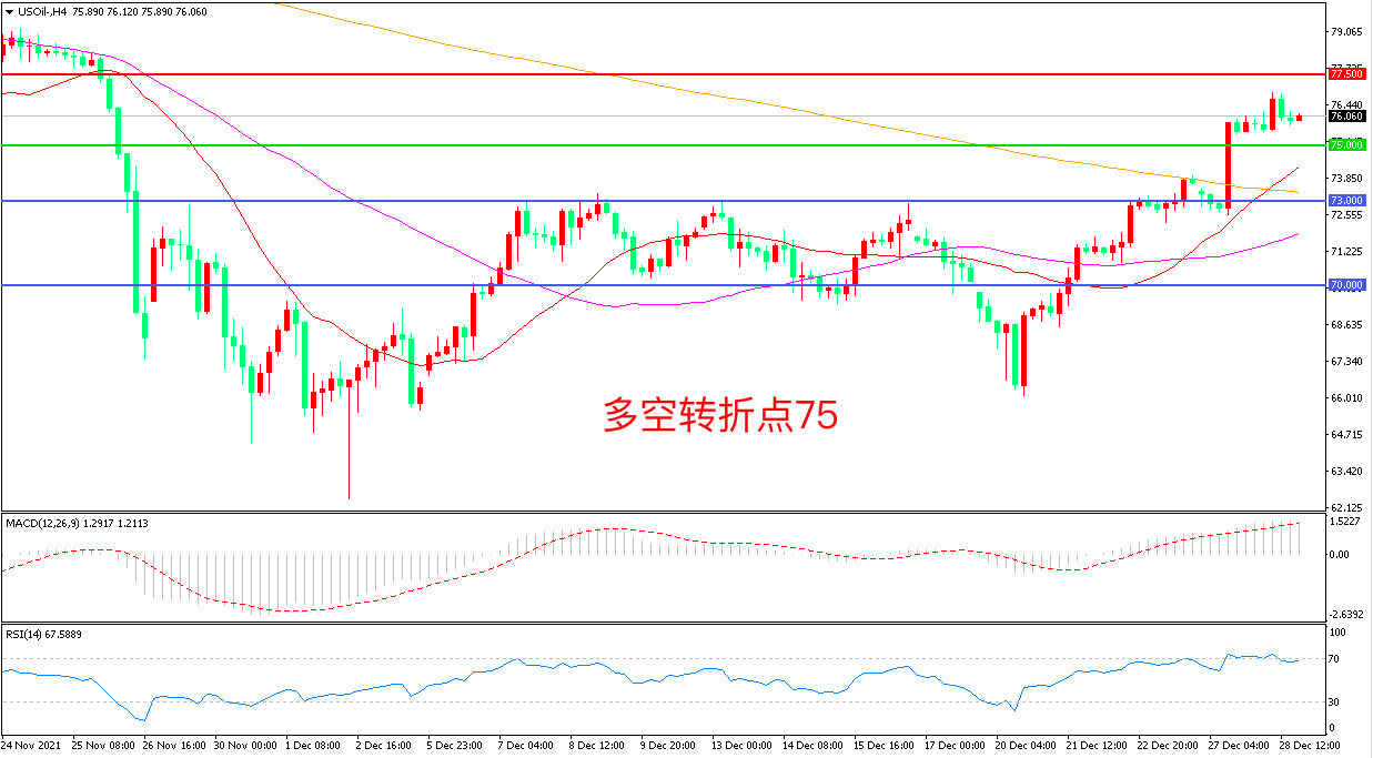 交易策略:在75.00之上看涨,目标77.50        80.00