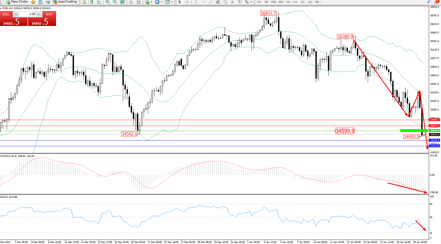 技术点评:空头动力延续布林带指标通道中下轨区间持续震荡下行,低位抵达34493位置节点后得到短暂支撑,该位已然破此前34542位置节点,且空头动力有继续向下移动态势,布林带指标呈缓慢张口向下移动走势中,MACD指标处于空头区域维持震荡持续向下移动,RSI指标处于50均衡线下方空头区域持续震荡下行;