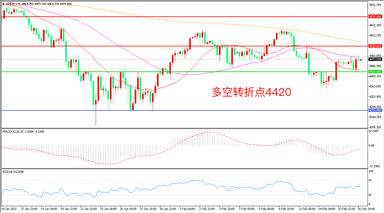 4小时图看,标普500回踩4420一线后企稳,短线走势回暖,均线系统走平,MACD绿柱缩短,RSI指标走平,日内延续震荡概率较大。