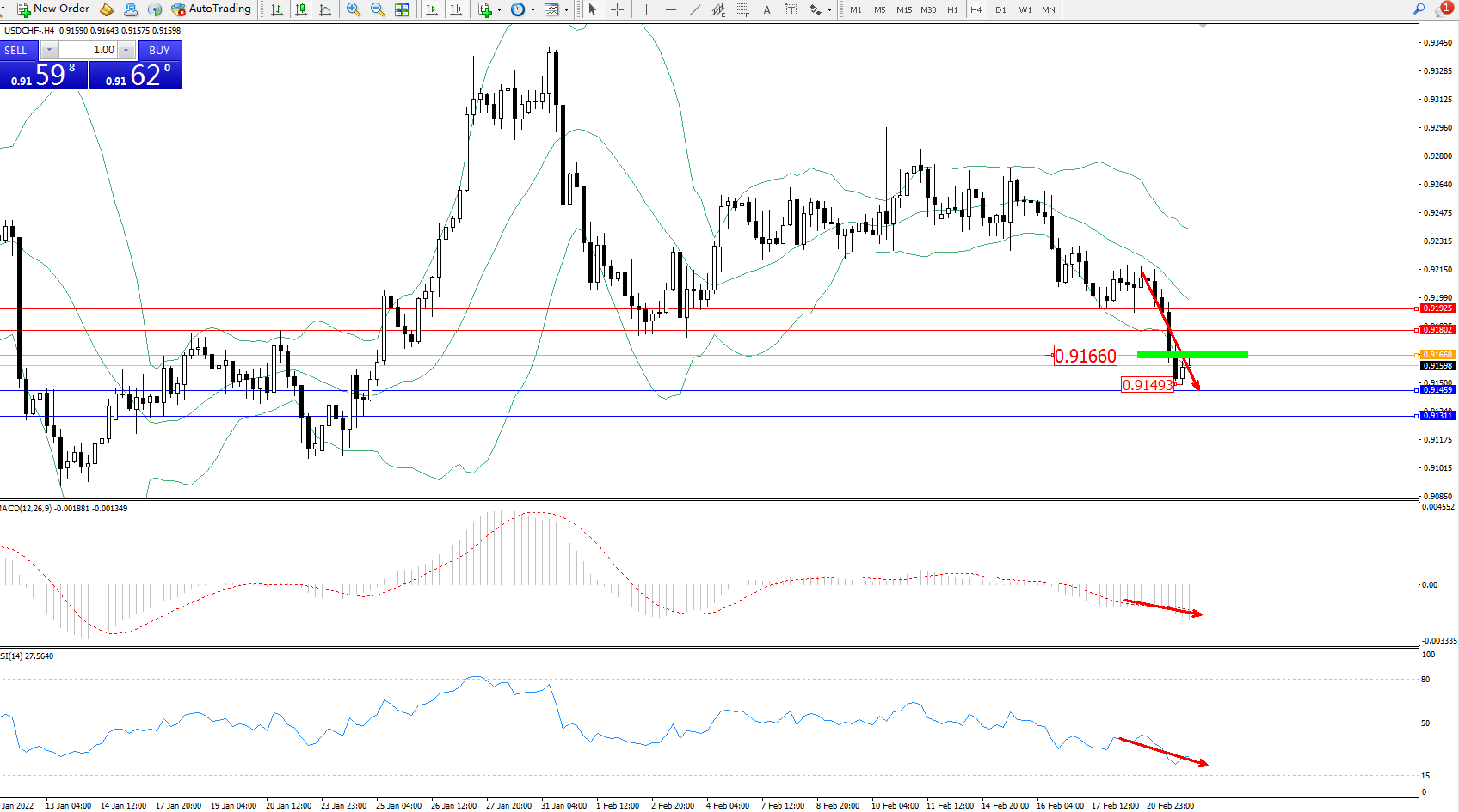 交易策略:0.91660下方看跌,目标0.91459、0.91311