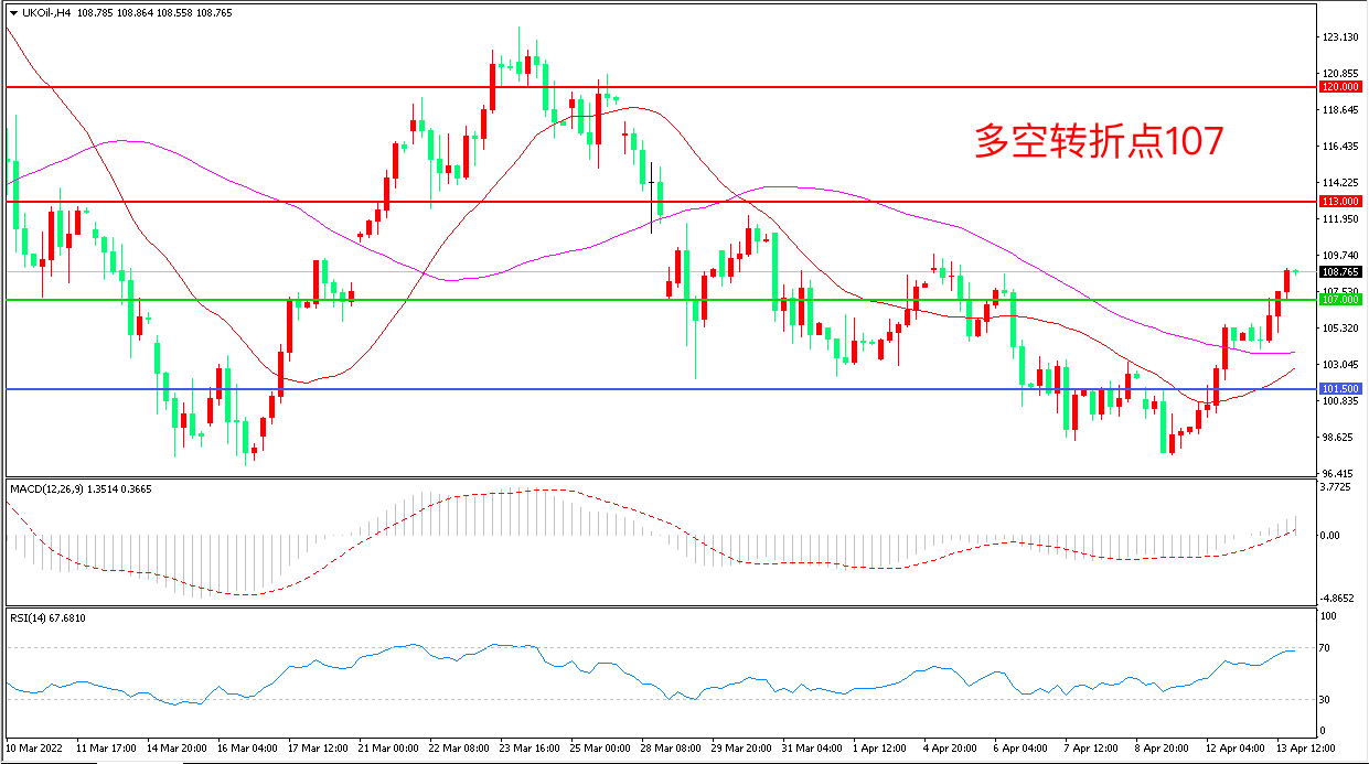 周三(4月13日),根据美国能源信息署公布的数据显示,当周美国EIA原油库存大幅度超预期,但精炼油库存和汽油库存大降加重了市场对供需失衡的担忧,布伦特原油延续强势表现,收报108.75美元/桶。此前普京表示与乌克兰的和平谈判已陷入“死胡同”,这是迄今为止最强烈的信号,美俄冲突加剧对油市多头形成了信心支撑。