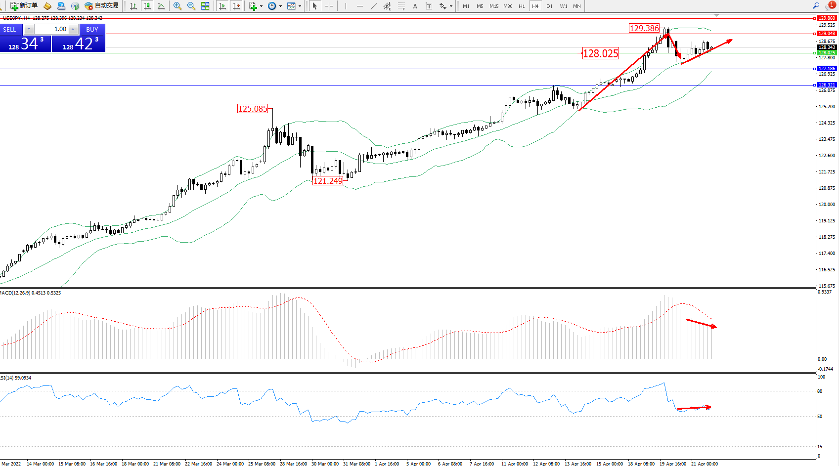技术点评:多头动力延续布林带指标通道中上轨区间持续震荡上扬,高位抵达129.386附近节点后短期回撤,但市场整体上行趋势态势良好,再度震荡向上拉升,布林带指标呈上行趋势走势持续中,高位开始缓慢收口中,MACD指标处于多头区域维持震荡下行,RSI指标处于多头区域维持整理平移中;