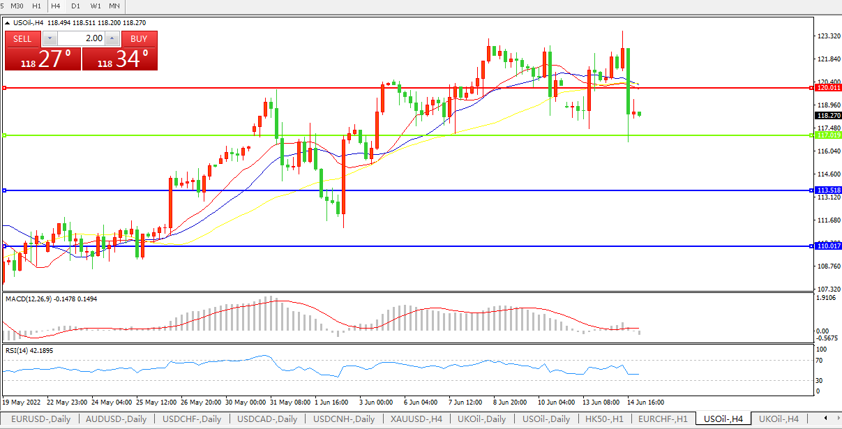 4小时图看,油价运行于均线附近,短线继续盘整概率较大, MACD动能柱逐步缩短,RSI指标中性偏弱,日内继续整理走弱概率较大。