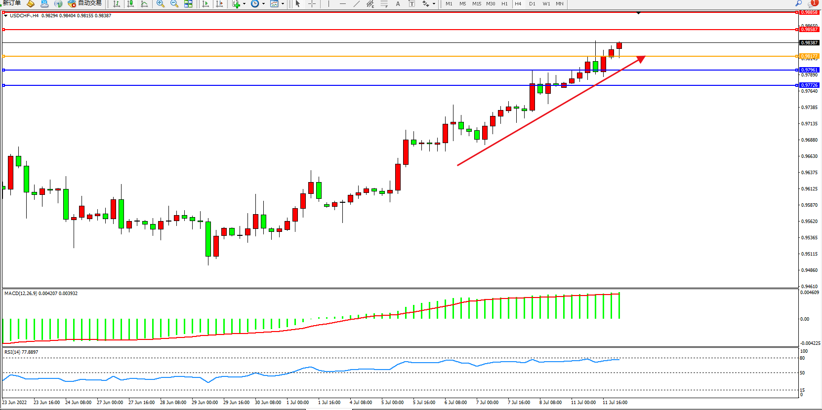 美元兑瑞郎维持0.98177附近震荡,由于预期美联储在应对飙升的通胀时将继续积极加息,美元一直再上涨。市场预计美联储将在7月26-27日的会议上将利率提高75个基点。联邦基金利率期货交易员对其指标利率的定价是,到3月份美联储将把利率从现在的1.58%上调到3.50%。