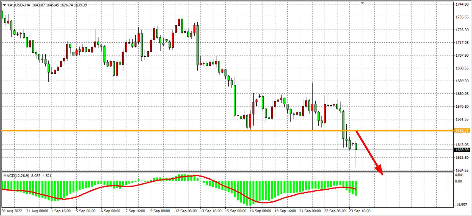 4小时图看,金价跌破1653的前低点支撑后,进入加速下行通道,MACD于零轴之下量能再度放大,显示空头趋势重新主导市场,日内延续下跌概率较大。