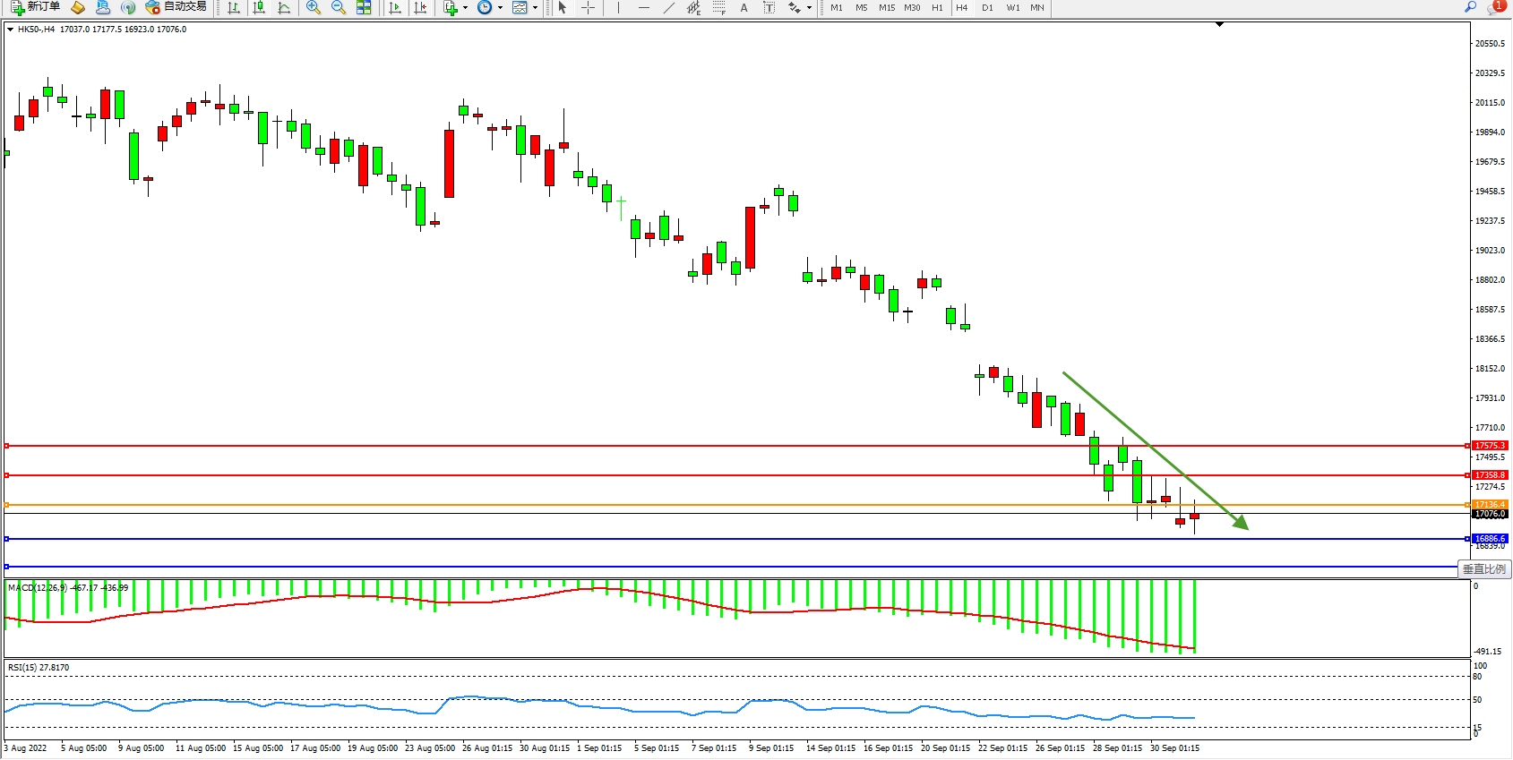 周二香港交易所重阳节,休市一日。香港恒生指数10月3日(周一)收盘下跌143.32点,跌幅0.83%,报17079.51点;三大指数延续下跌惯性,恒指盘中跌破17000点创2011年10月份以来新低,地产股在政策的刺激下表现最为抢眼,尤其是内房指数,大涨逾4%,行业内个股宝龙地产涨13.7%,上交易日大涨9%的碧桂园再涨8.8%;恒生指数有限公司将于2022年11月18日(星期五)宣布2022年第三季度之恒生指数系列检讨结果。