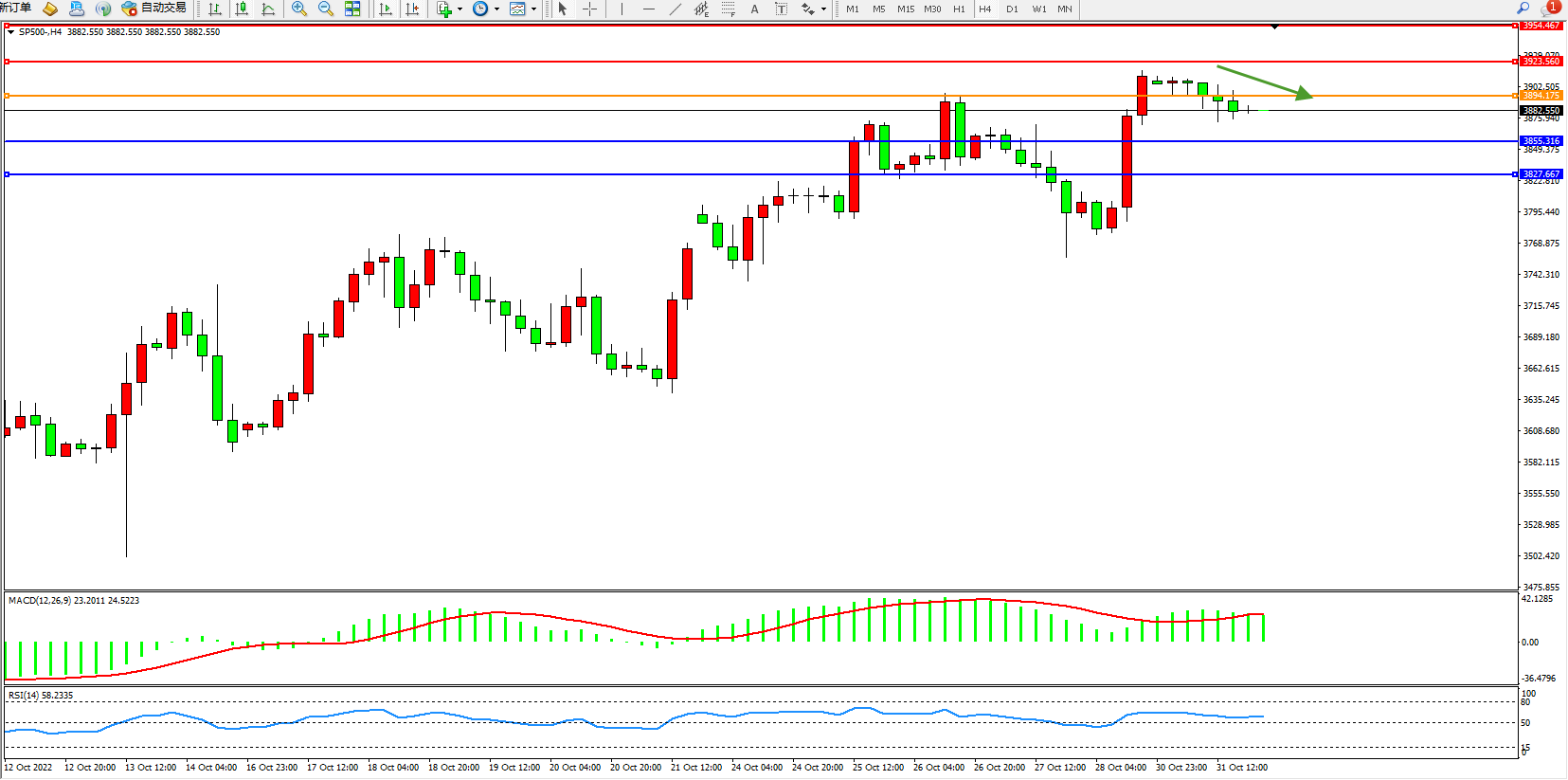 标普500指数10月31日(周一)收盘下跌29.03点,跌幅0.74%,报3872.03点;市场参与者将寻找线索,以强化近期对美联储在11月后下调加息幅度的猜测。美联储19位决策者中的大多数预计能够在12月开始放缓加息步伐,并在2023年达到4.50%-4.75%的政策利率峰值。