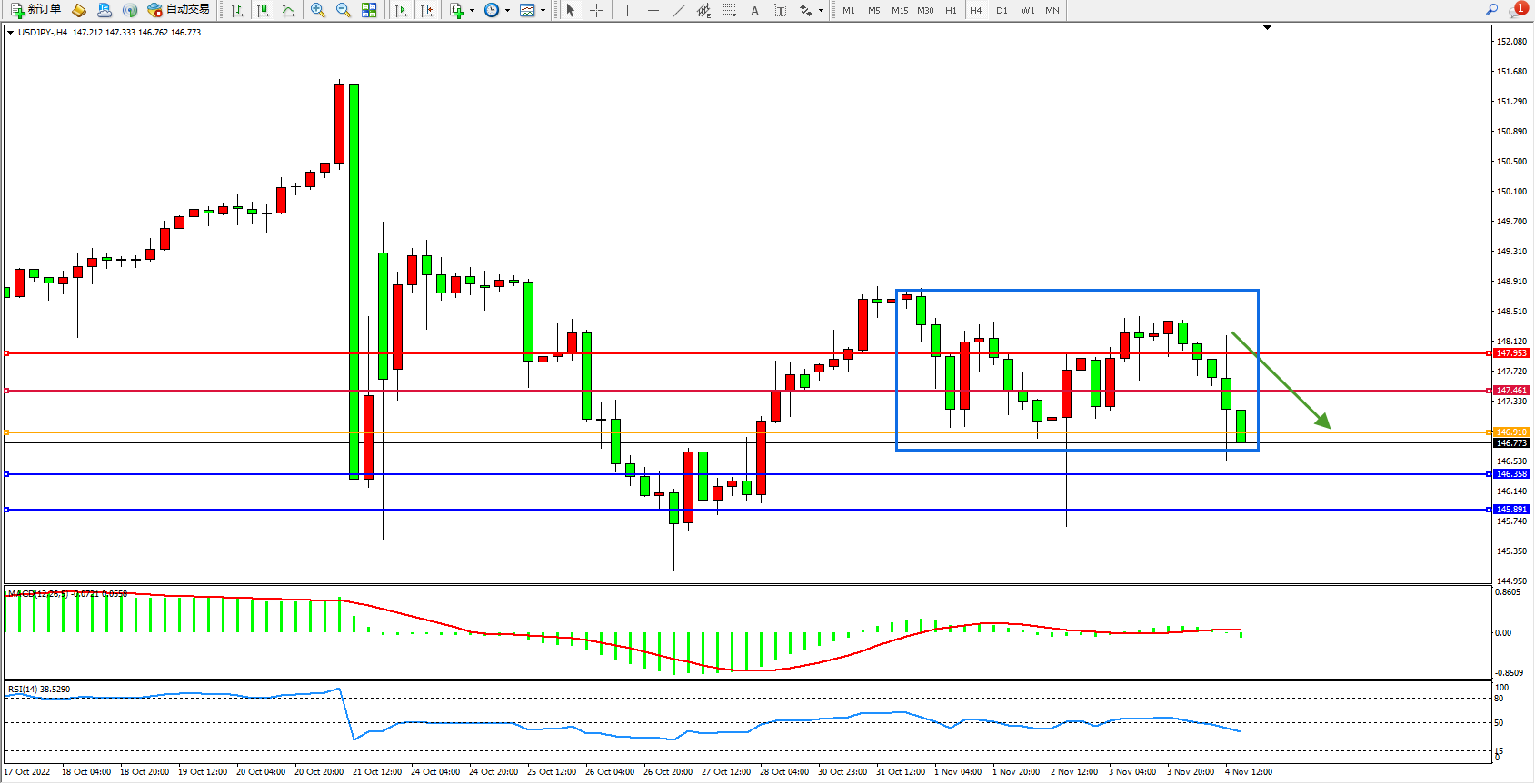 交易策略:146.910下方看跌,目标146.358、145.891