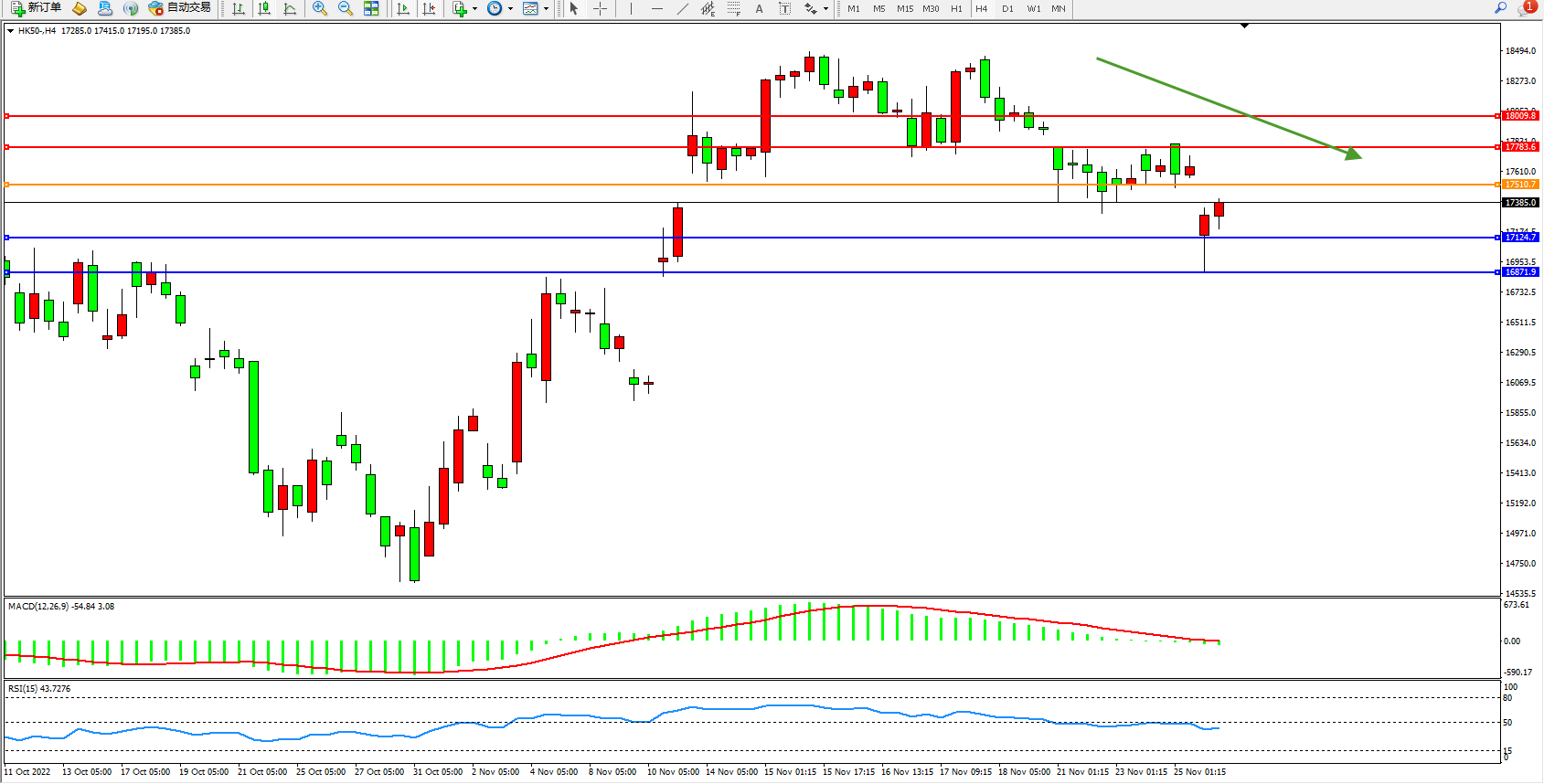 香港恒生指数11月28日(周一)收盘下跌275.64点,跌幅1.57%,报17297.94点;港股今日呈现低开高走行情,但三大指数仍大幅收跌,恒指、国指分别跌1.57%和1.65%,二者盘初均跌超4%,恒生科技指数跌1.93%,盘中更是大跌超5%。大型科技股普遍走低,京东跌4.3%,阿里巴巴跌超3%,百度、网易、小米、腾讯皆下跌,南下资金全日净流入84.92亿港元,大市成交额为1182亿港元。
