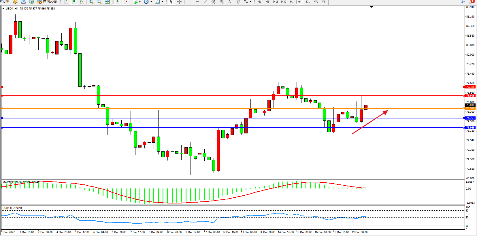 原油维持75.838附近震荡,市场对亚洲原油需求的乐观憧憬给油价提供支撑,但此前美联储和欧洲几家央行就加息发表鹰派言论,引发人们对可能出现经济衰退的担忧,而且下行趋势线对油价压制比较明显,需要提防油价的进一步下探风险。