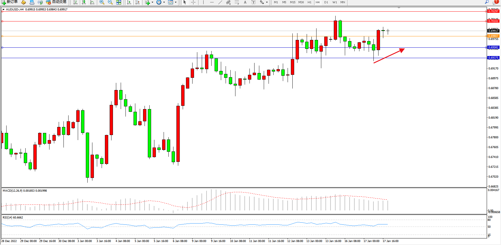 交易策略:0.69807上方看涨,目标0.70102、0.70297