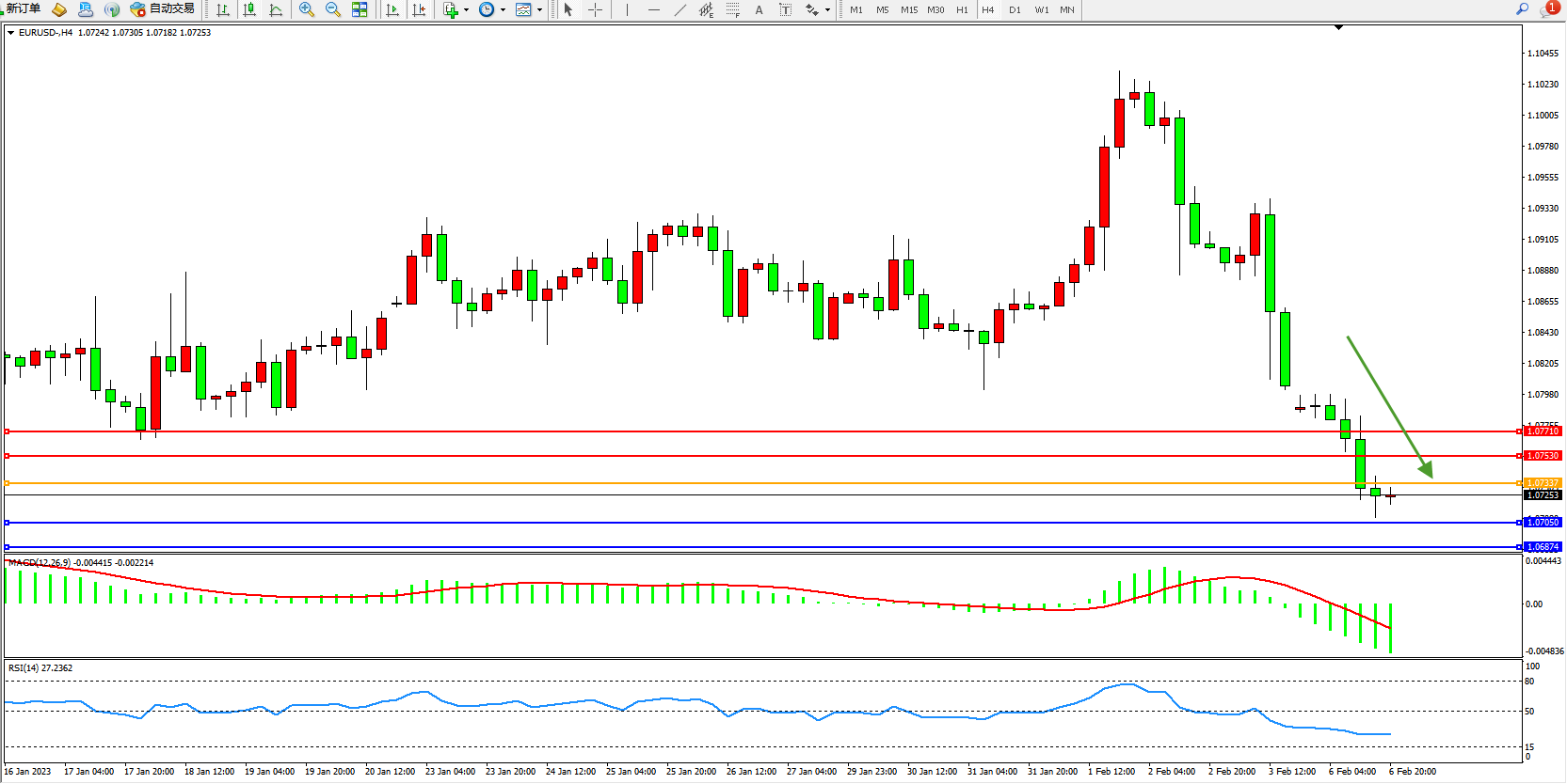 欧元美元EURUSD—4小时K线图显示: